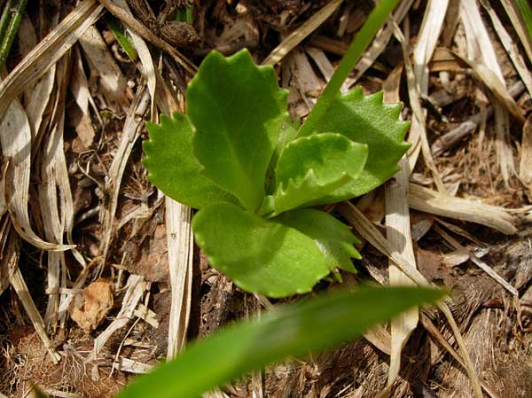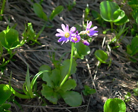 よく似たユキワリコザクラは葉が裏側に巻いて,柄は急に細くなり葉の部分とハッキリ区別できます。ハクサンコザクラの葉は表側に巻気味になります。また,葉の柄の部分が幅広です。