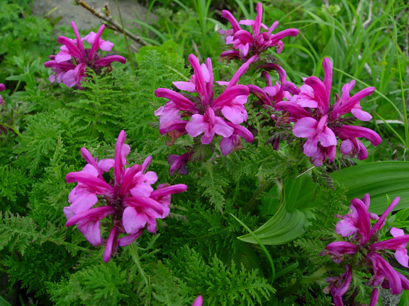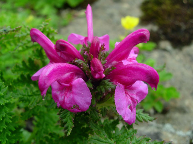 茎の上部の心花が付きます。ヨツバシオガマは段重ねで花が付きます。 花を上から見ると車輪状に見えます。 上唇が殆ど尖りません。 茎に四つの稜があります