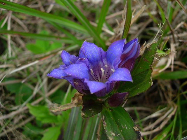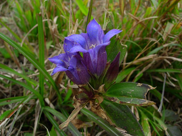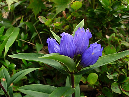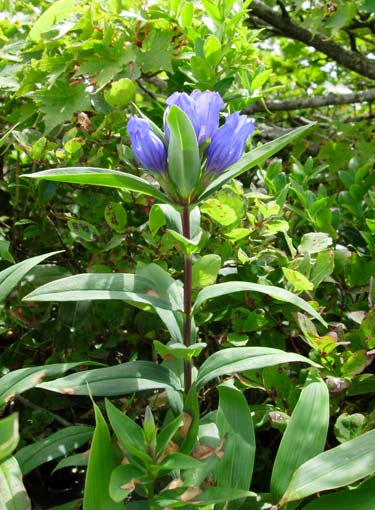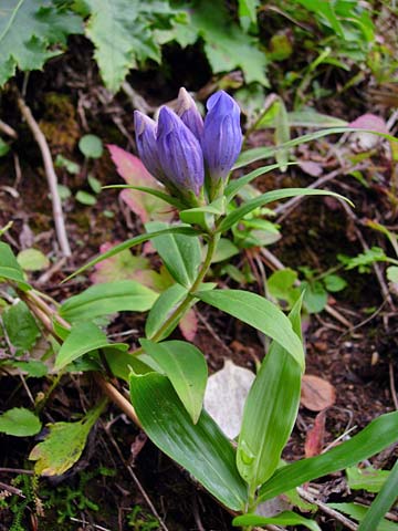よく似たオヤマリンドウとは区別が難しいようです。図鑑によるとエゾオヤマノリンドウは花が全開花し,オヤマリンドウは花を少し開く程度とのことです。しかし,エゾオヤマノリンドウが全開花するのは,私の経験(少ない)では秋遅くのような気がします。また,他の図鑑によるとオヤマリンドウの葉には3本の明瞭な葉脈があり,エゾオヤマノリンドウには1本の葉脈が目立つとのことです。このことから以下の写真のものをエゾオヤマノリンドウとしました。