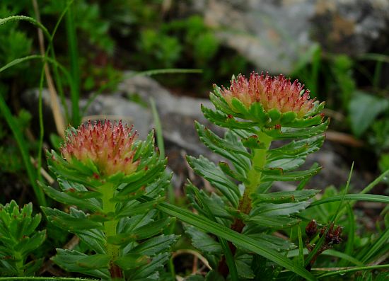 ホソバイワベンケイは葉に段状の鋸歯があり,イワベンケイは鋸歯が無く丸い葉になっています。