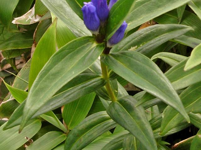 よく似たエゾオヤマリンドウとは区別が難しいようです。図鑑によるとエゾオヤマノリンドウは花が全開花し,オヤマリンドウは花を少し開く程度とのことです。しかし,エゾオヤマノリンドウが全開花するのは,私の経験(少ない)では秋遅くのような気がします。また,他の図鑑によるとオヤマリンドウの葉には3本の明瞭な葉脈があり,エゾオヤマノリンドウには1本の葉脈が目立つとのことです。そのことから以下の写真のものをエゾオヤマノリンドウとしました。