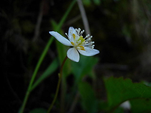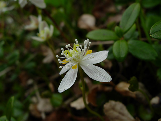 バイカオウレンとの違いは,開いた時に萼片(白い花びらに見える)の間に,隙間ができます。バイカオウレンは開いた時に萼片が重なっています。
