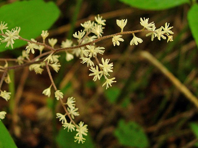 よく似たユキザサに比べ花を付ける小枝がよく分岐しています。また,ユキザサは両性(オシベメシベあり)ですが,ヤマトユキザサは雌雄異性(雌雄異株)です。 雌雄異性(雌雄異株)で,さらによく似た種のヒロハユキザサは花ビラに見える(萼片)色が緑がかっています。 ヤマトユキザサはヒロハユキザサ,ユキザサに比べ茎に軟毛が密生しています。