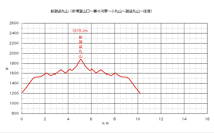 群馬 袈裟丸山(折場登山口〜賽の河原〜小丸山〜前袈裟丸山〜往復)について25,000分の1の地形図から,水平歩行距離と高度を算出し,その山の標高図を作製しました。
