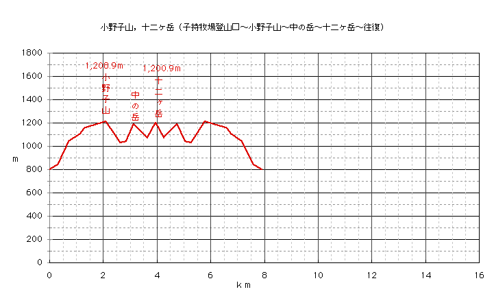 群馬 小野子山〜十二ヶ岳(子持ち牧場赤芝登山口(高山村)〜小野子山〜中岳〜十二ガ岳の往復)について25,000分の1の地形図から,水平歩行距離と高度を算出し,その山の標高図を作製しました。