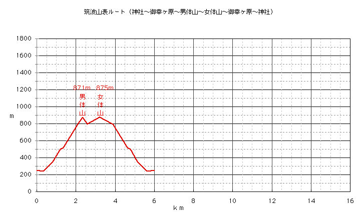 茨城 筑波山(いわゆる表登山ルートと言われている。筑波神社〜山頂コル〜男体山〜女体山〜山頂コル〜筑波神社)について25,000分の1の地形図から,水平歩行距離と高度を算出し,その山の標高図を作製しました。