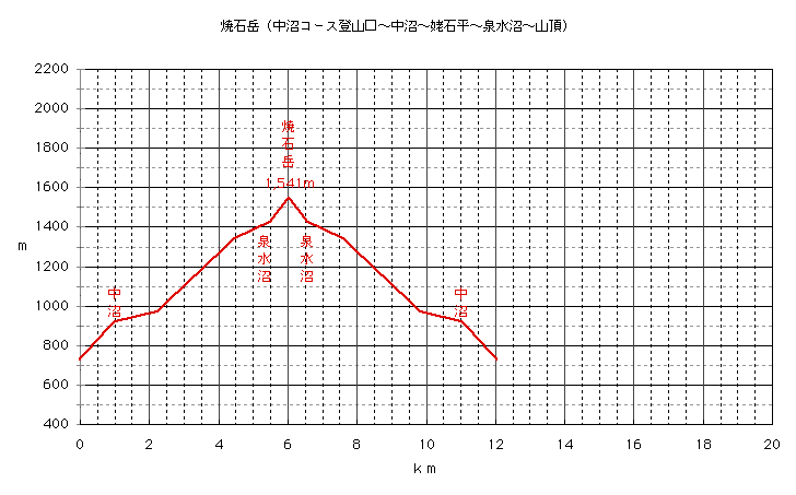 焼石岳(中沼コース登山口〜中沼〜姥石平〜泉水沼〜山頂)について25,000分の1の地形図から,水平歩行距離と高度を算出し,その山の標高図を作製しました。