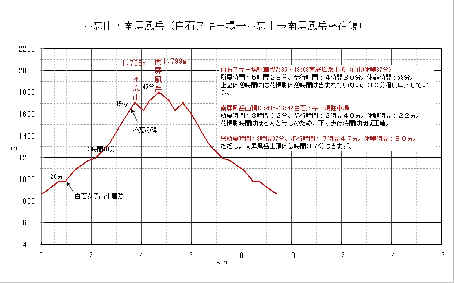 不忘山→南屏風岳標高図