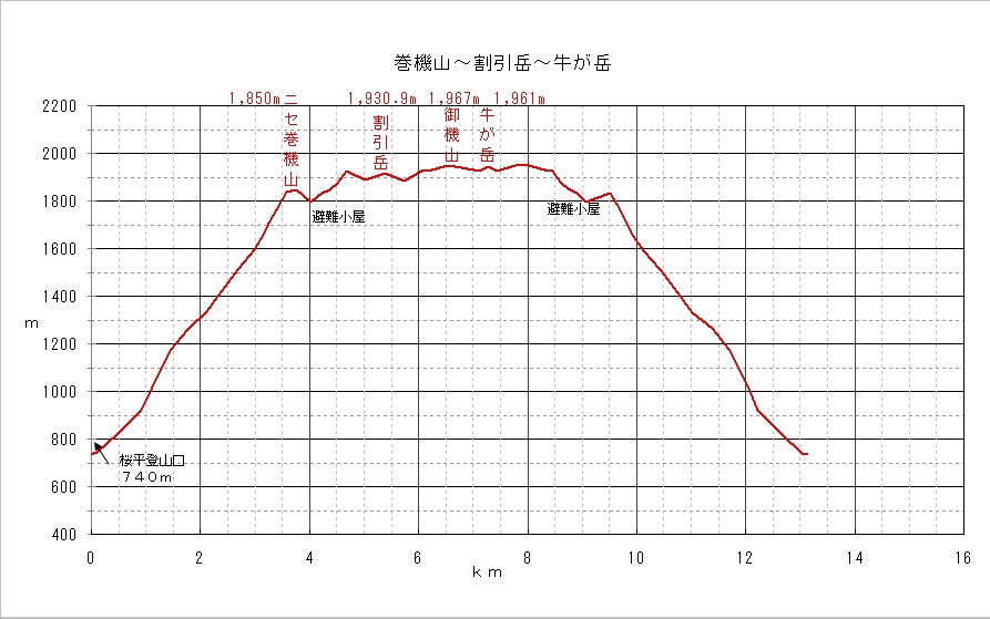 巻機山井戸尾根コース(御機山,割引岳,牛が岳標高図