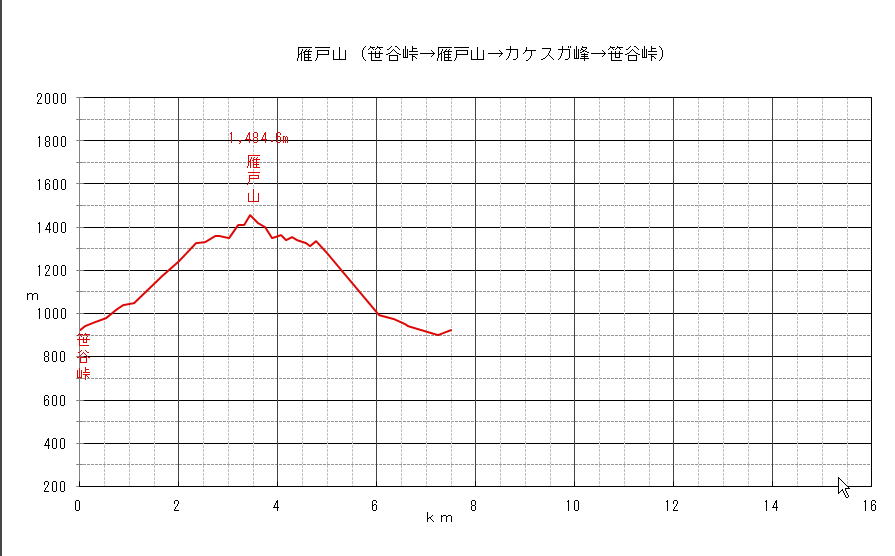 雁戸山(笹谷峠→雁戸山→カケスガ峰→笹谷峠)標高図