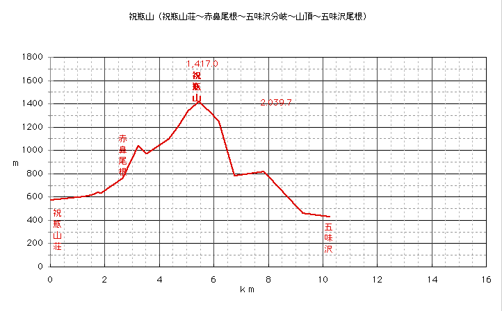 祝瓶山(祝瓶山荘〜赤鼻尾根〜五味沢分岐〜山頂〜五味沢分岐〜五味沢登山口)標高図