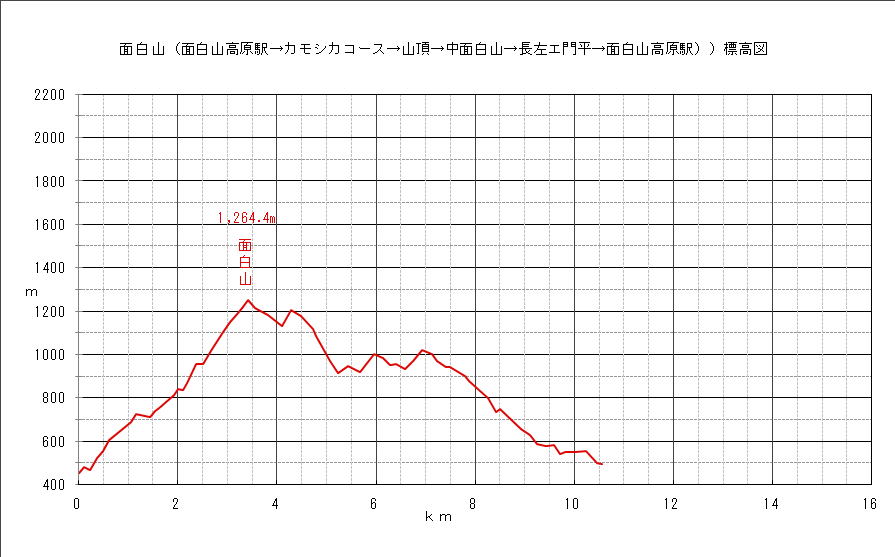 面白山(面白山高原→カモシカコース→山頂→長左エ門平→面白山高原)標高図