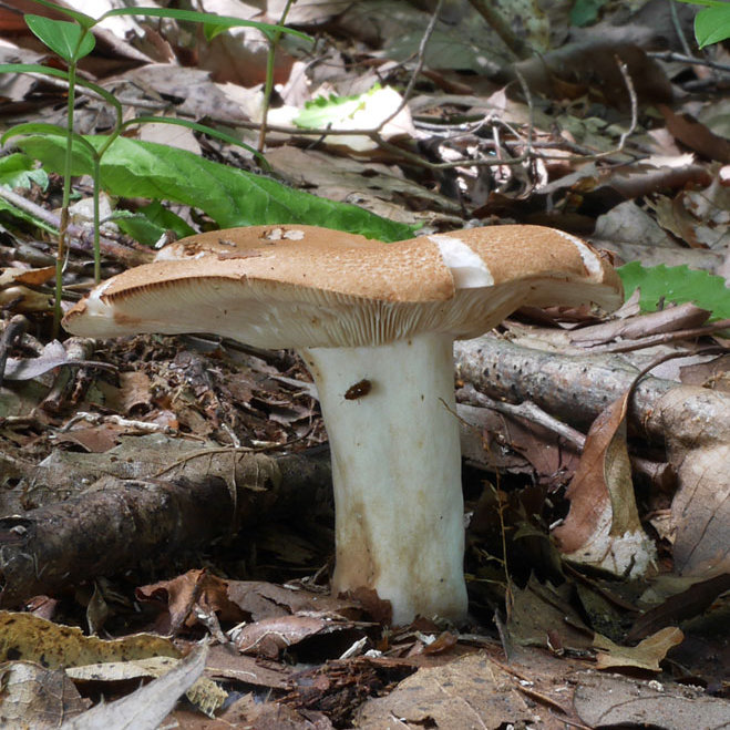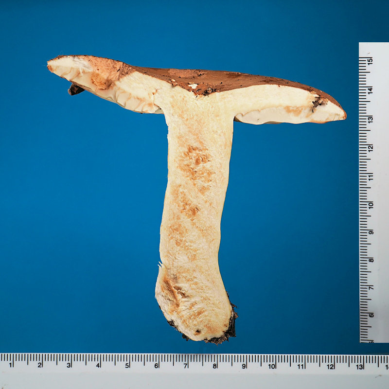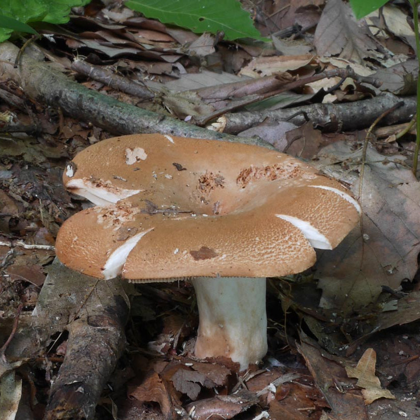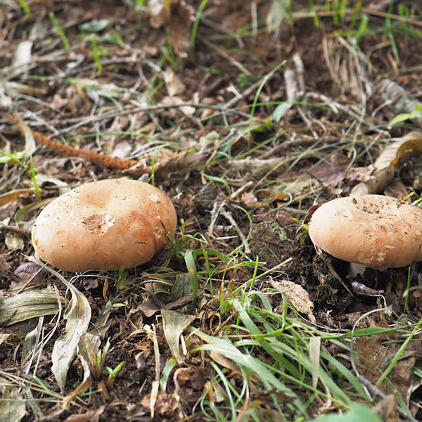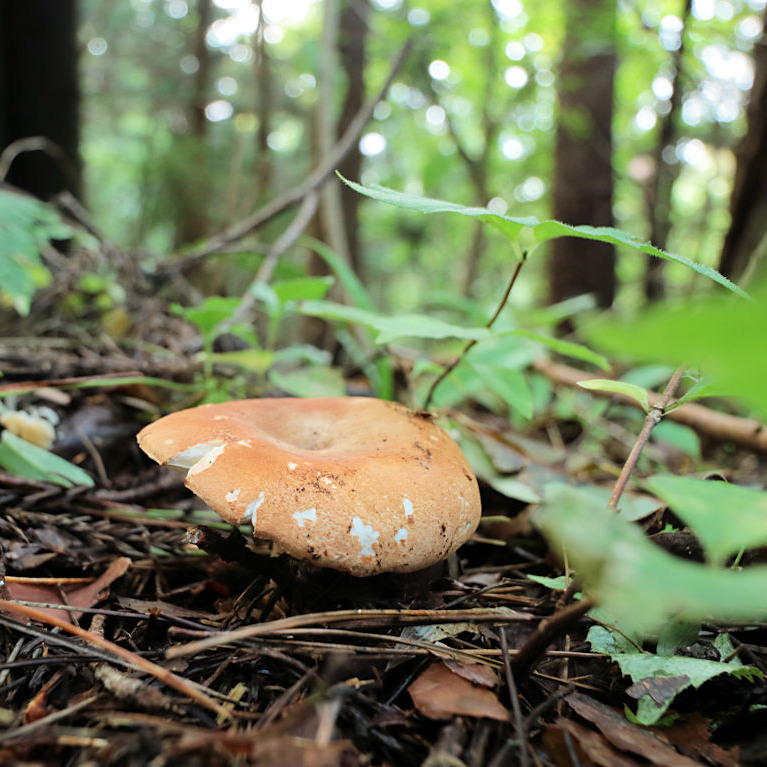 夏〜秋にアカマツとコナラ類の混生林地上に発生する