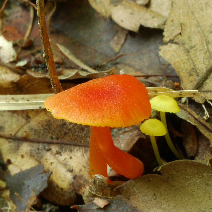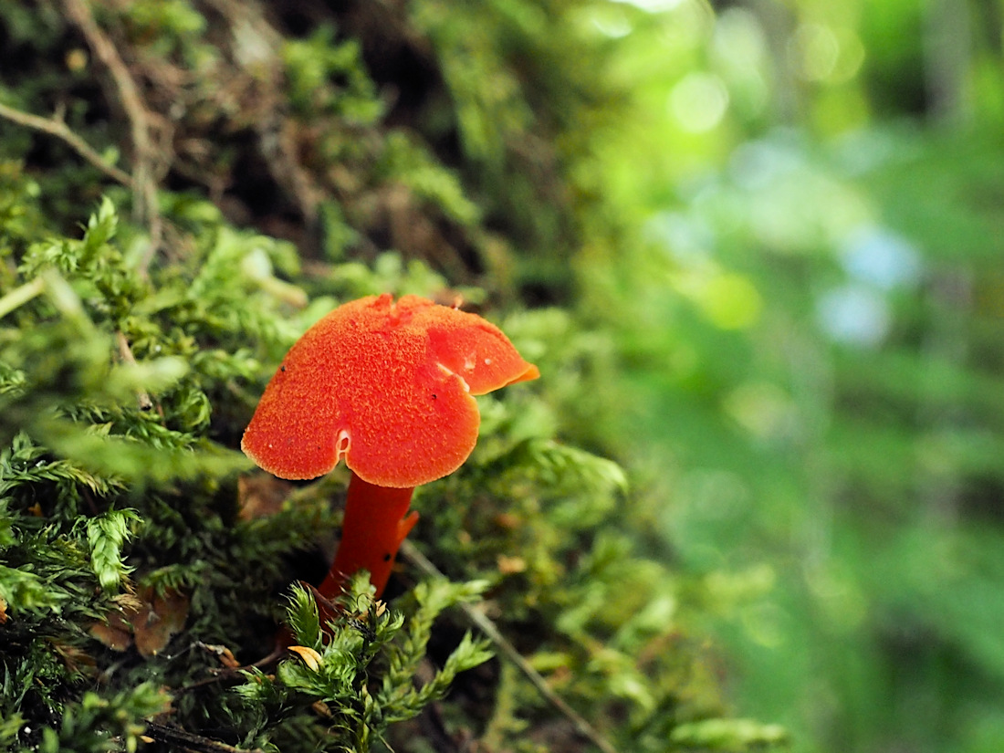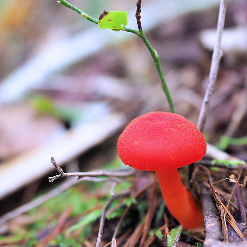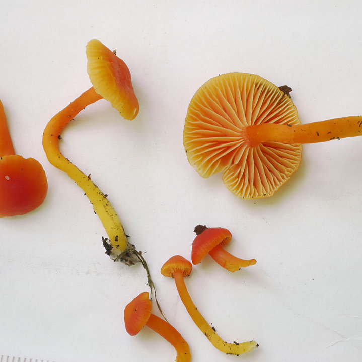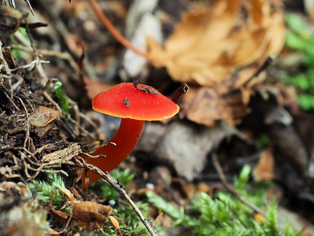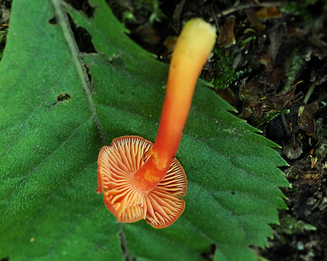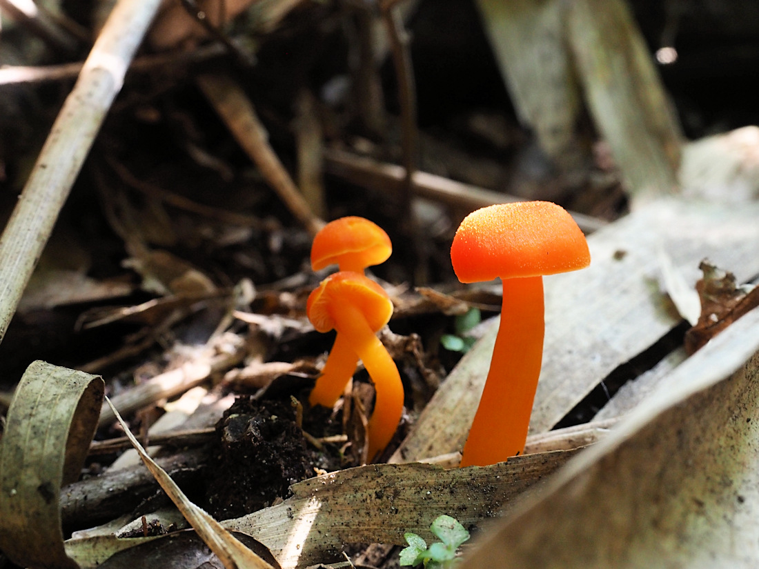 2015年(平成27年)09月15日撮影地 福島県会津の子実体は柄が長く半透明の条線らしきものが確認できるのでHygrocybe miniata f.longipesとした。