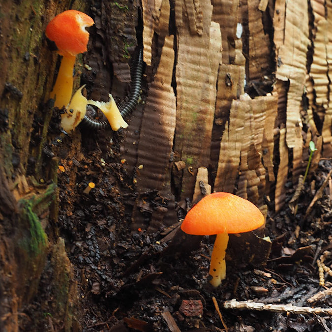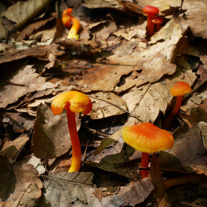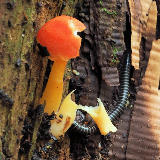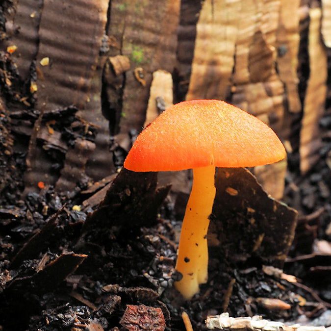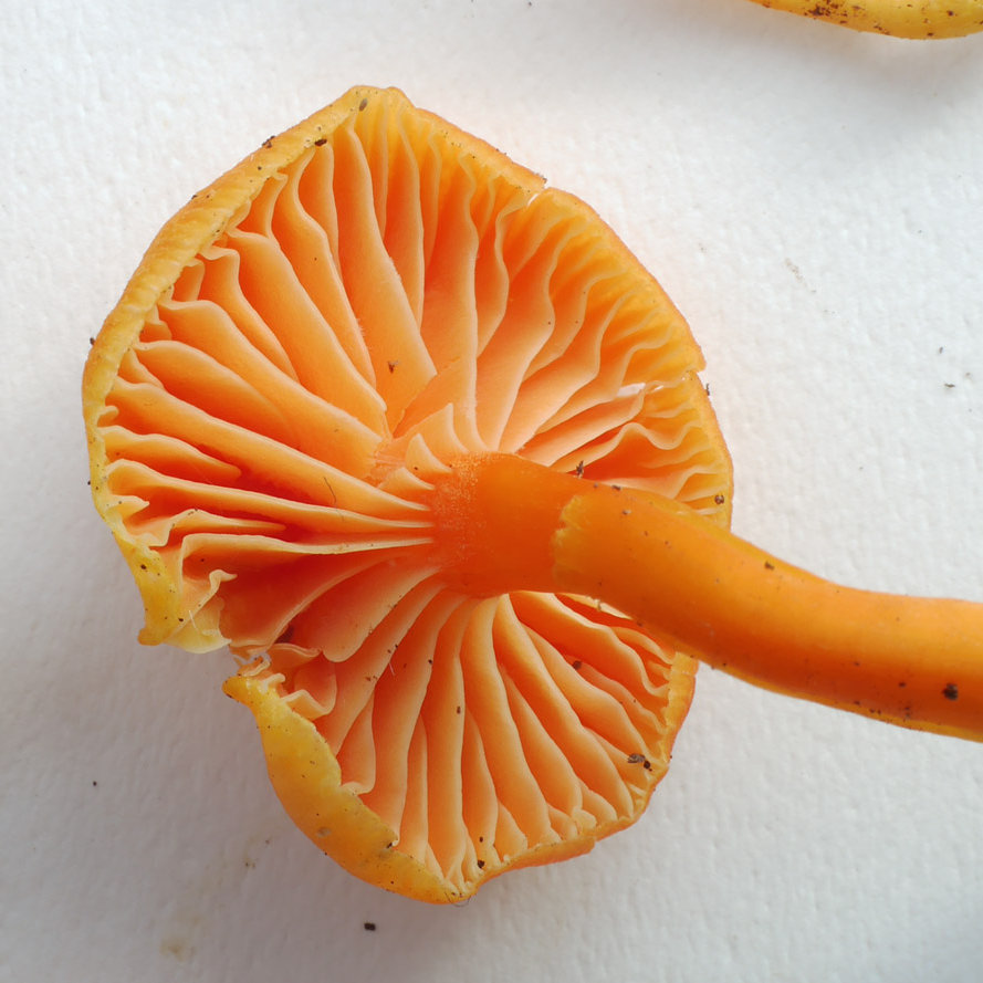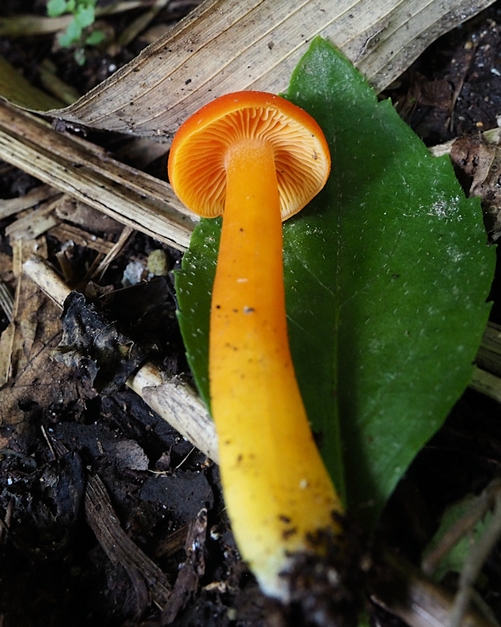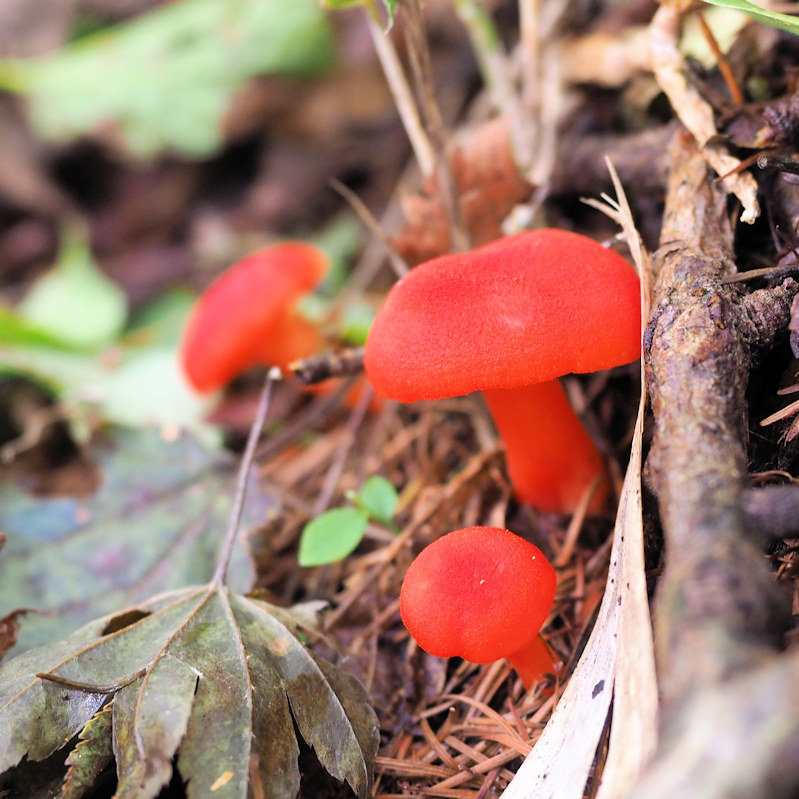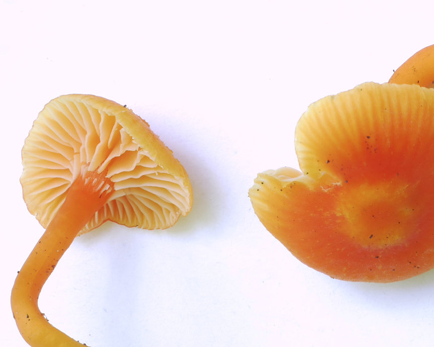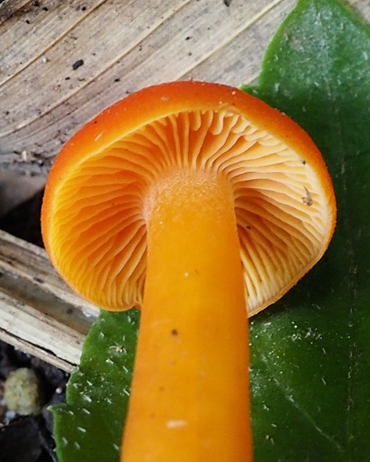 2015年(平成27年)09月15日撮影地 福島県会津の子実体は柄が長く半透明の条線らしきものが確認できるのでHygrocybe miniata f.longipesとした。