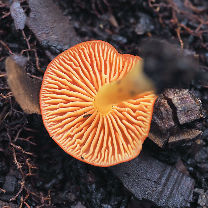帯赤色−橙色−帯黄橙色→しだいに黄色変する 疎 直生−上生−やや垂生
