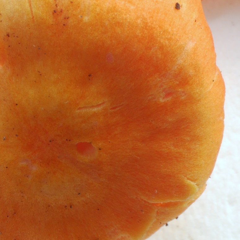 1.0-4.0p 丸山形→まんじゅう形→ほぼ平ら−成熟するとときに中央部くぼむ 朱赤色−橙紅色→しだいに黄色変する 粘性なし フェルト状−細鱗片に覆われる 鱗片は黒く変色しない