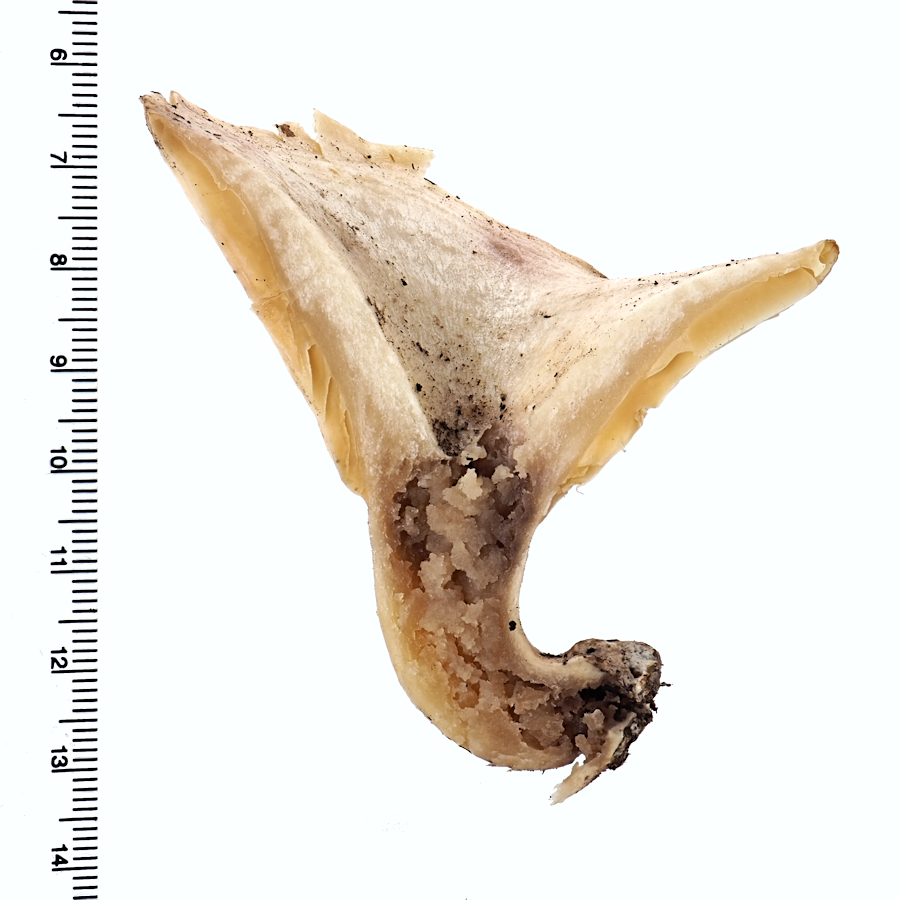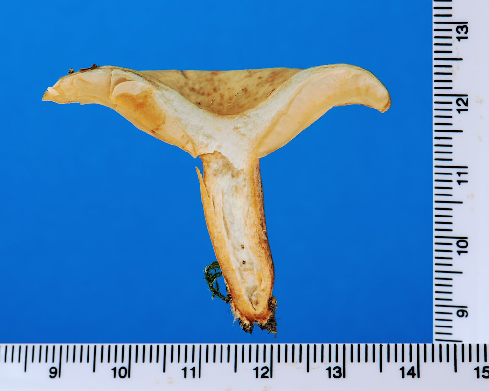 肌色(淡橙黄色-淡帯赤黄色) 柄の表皮下は淡赤褐色 切断面は新鮮な子実体では淡黄色に変色する やや老成すると変色しないもの多い