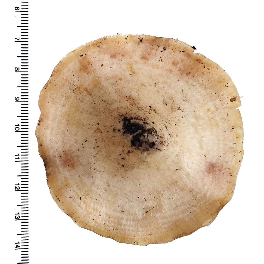 2.5-4.5cm 中央くぼむまんじゅう形→中丘漏斗型 縁部は遅くまで内巻き 淡暗緑黄色−淡帯暗緑黄灰褐色→淡赤褐色−赤褐色 乾燥するとベージュ色(明るい灰黄色)で条線あらわす 赤褐色−赤橙色のシミあること多い ほぼ平滑 湿時弱粘性