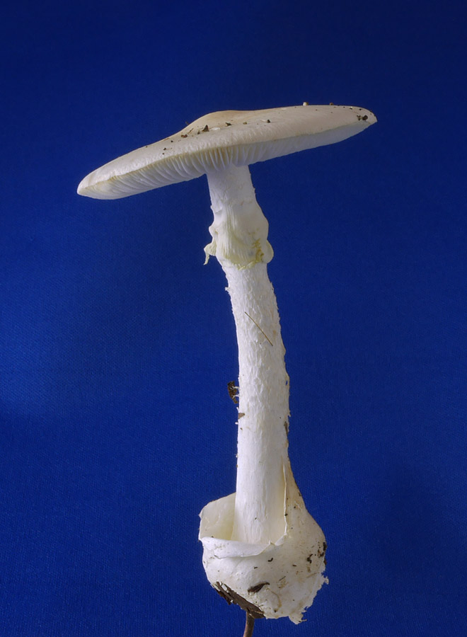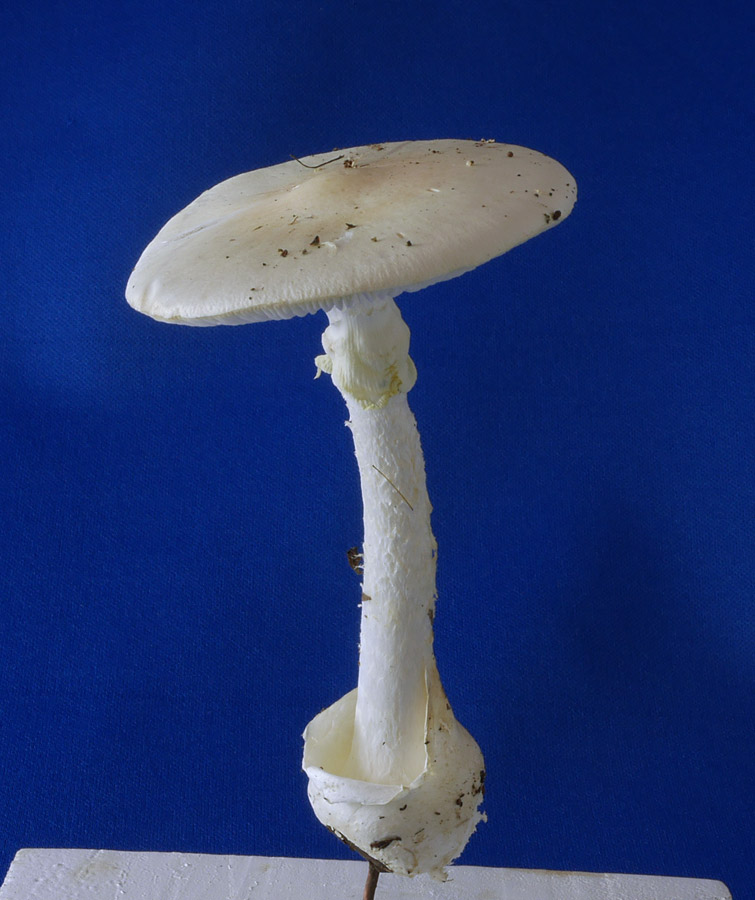 4.0p-15.0p×30o? 上下同幅−若干上方に向かい細い 白色−類白色 平滑−ささくれ状鱗片密布−白色繊維状-ささくれ状小鱗片 柄の上部に膜質の白色つばがある つばは脆い つば上面に条線のようなものあり 基部は球状−類球形 基部に袋状でこぶ様の白色のつぼあり 直径7-
