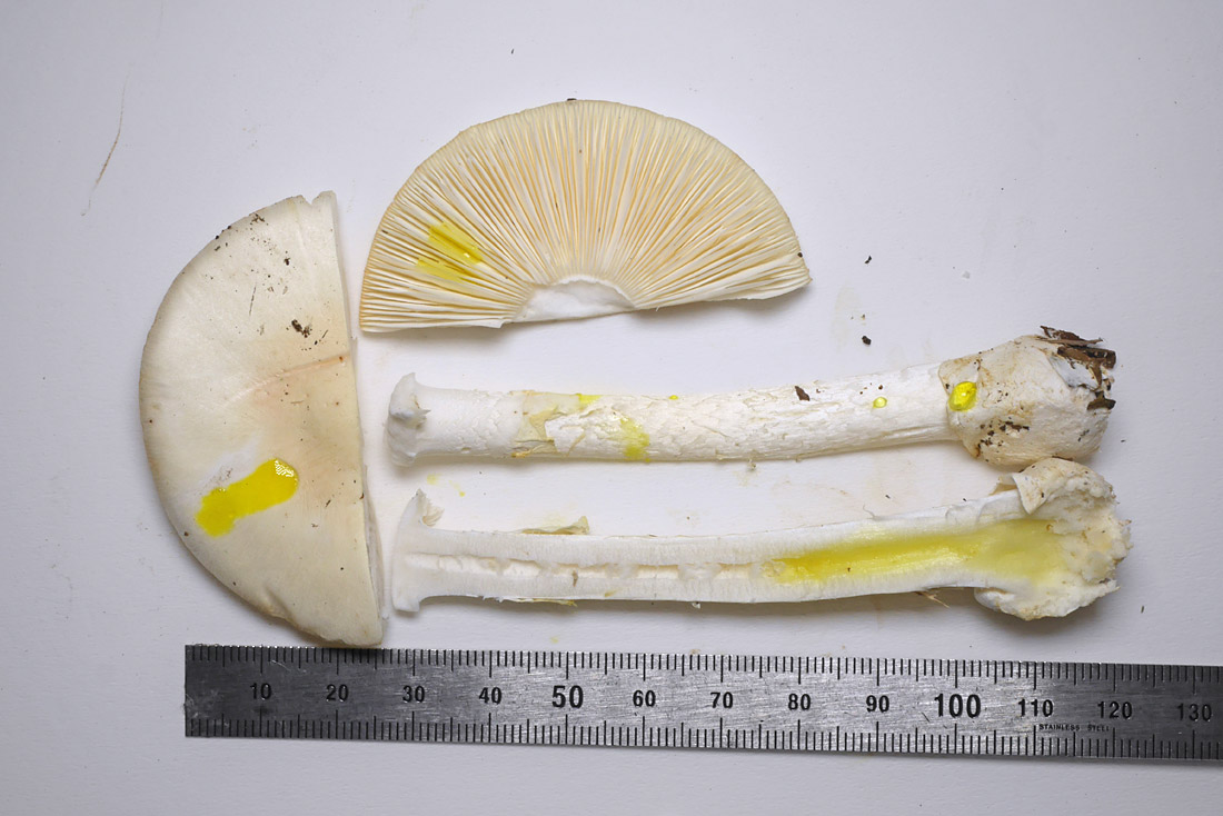 (注)傘表皮の色について;半日以上経過後(標本撮影時)は全体に淡橙黄色になってきた。参照文献には解説されていないが、この種の特徴だろうか。