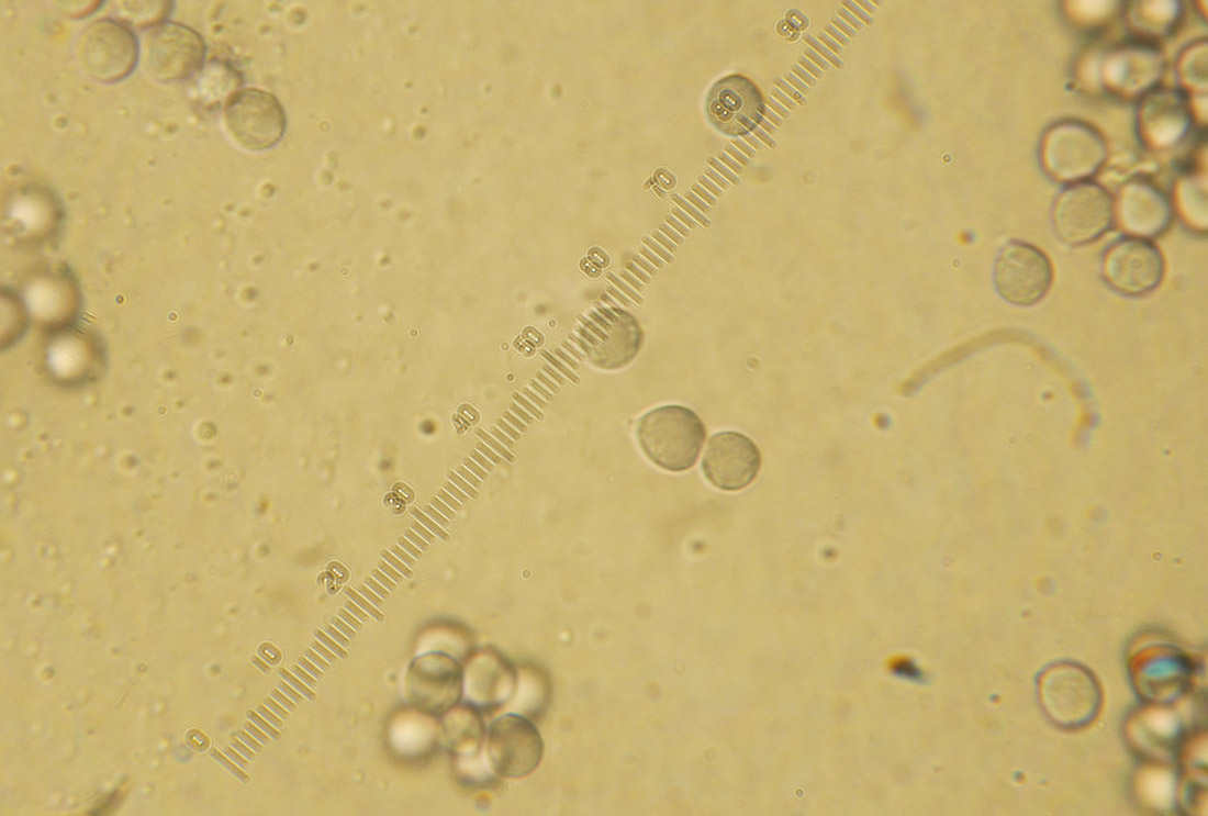 胞子紋は白色 胞子は球形−類球形 アミロイド