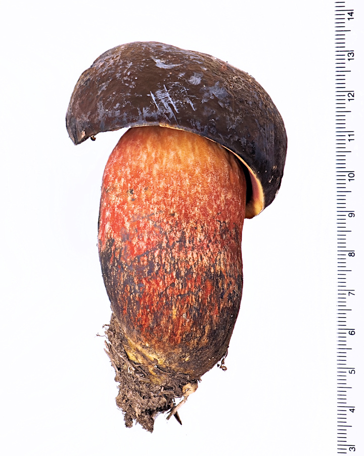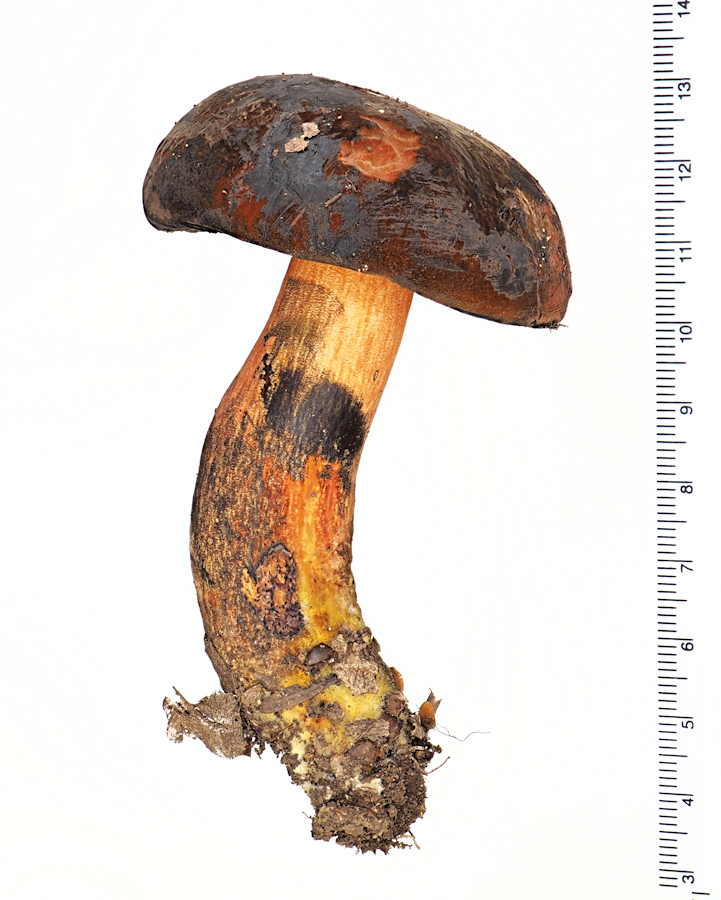 5.0-14.0cm×10-20mm 上下同径−上方に向かいやや細まる 基部は黄色菌糸におおわれる 地色は黄色 暗赤色−帯褐赤色−紅褐色の細点密布 ときに不明瞭な網目あらわす 触れると暗青色変→褐色−黒ずむ ときに頂部に細かい網目模様を表す 中実