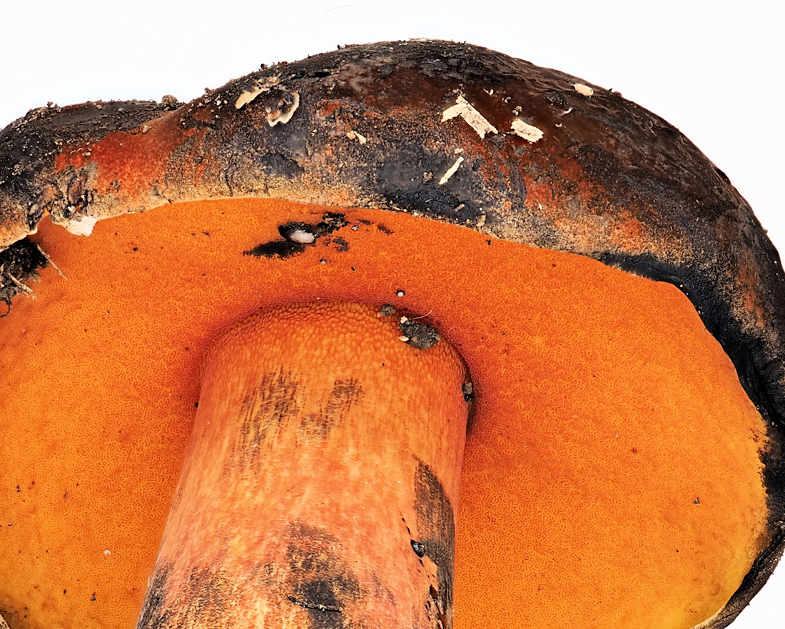 黄色→オリーブ黄色 孔口は血紅色−血赤色−帯褐赤色だが傘縁付近では淡い 孔口は円形 2-3個/mm 上生−離生 傷口暗青色変する→褐色しみ化
