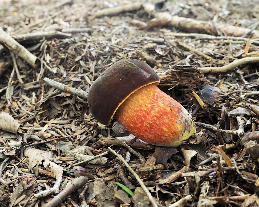 4.0-14.0cm 半球形→饅頭形→浅皿状 湿時弱粘性 ビロード状→無毛平滑 色は変化が多く褐色−帯赤褐色−帯黄褐色−暗褐色−帯赤褐色−赤褐色など 傷あるいは強くこすると暗青色変する
