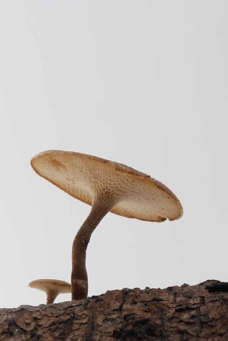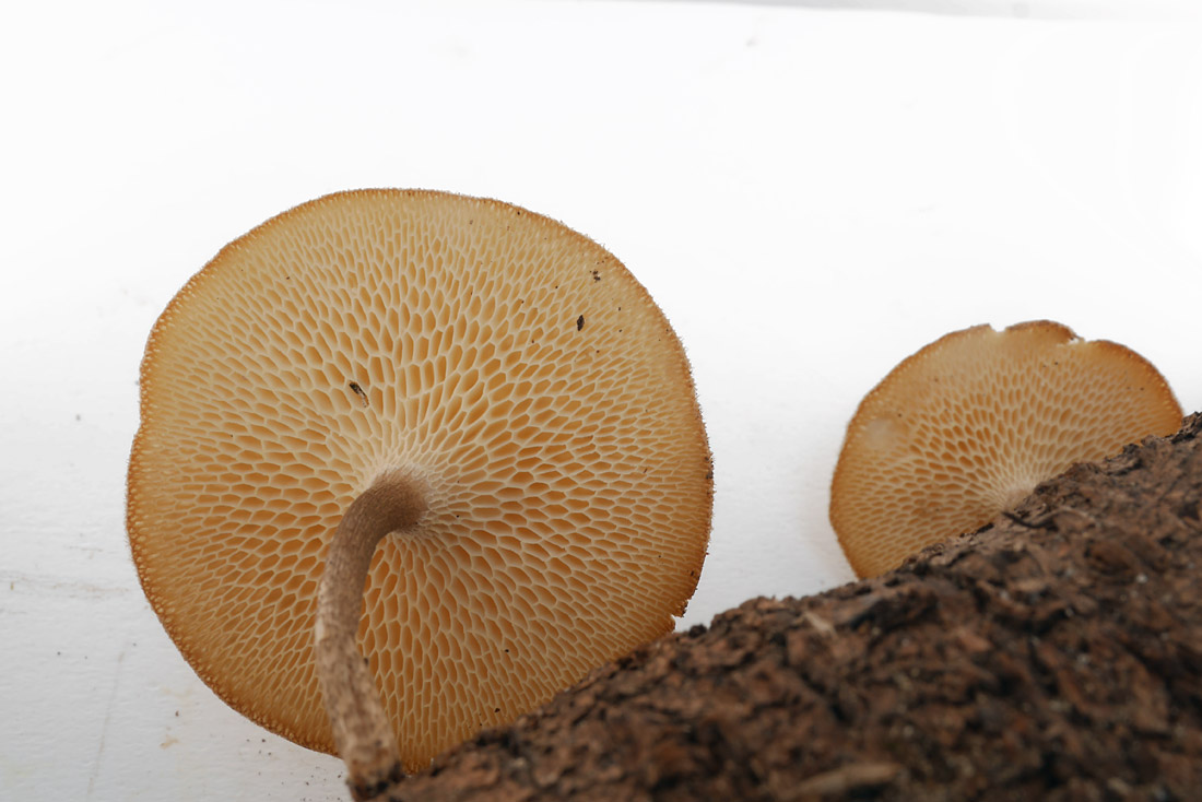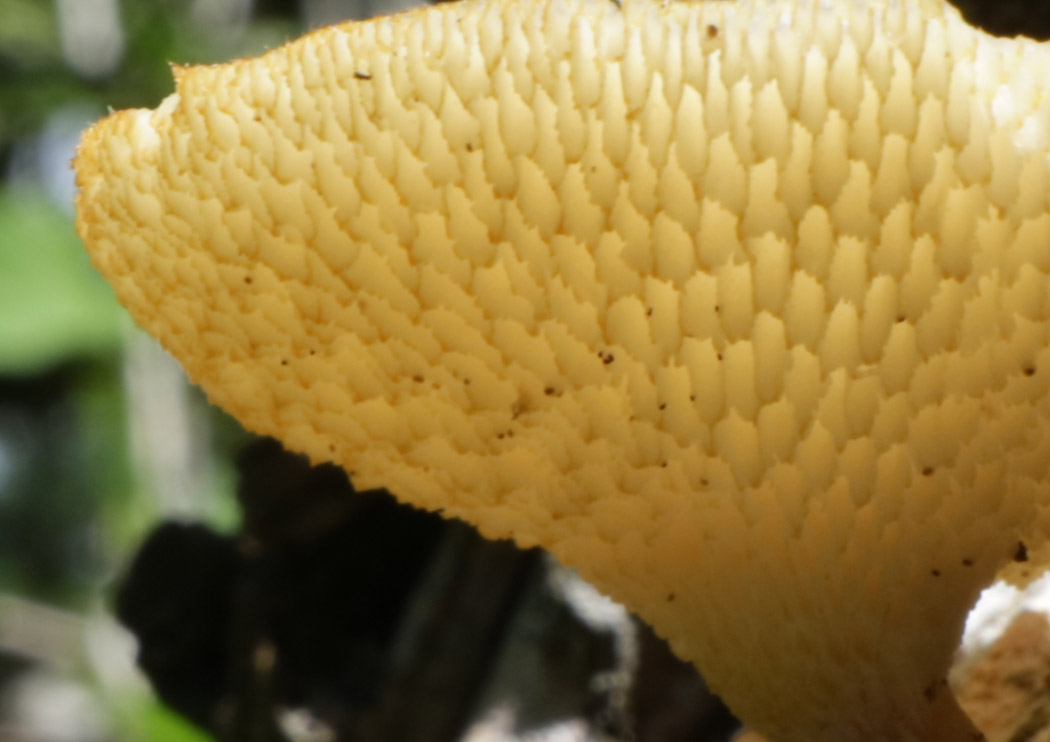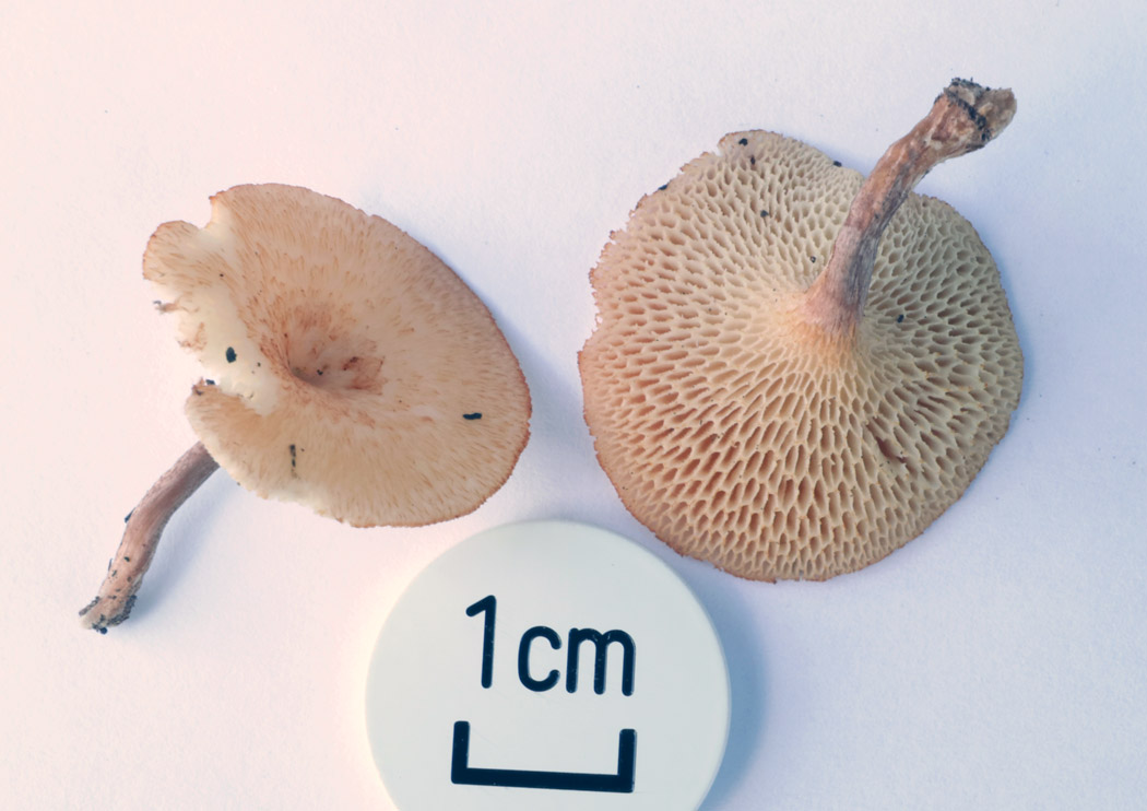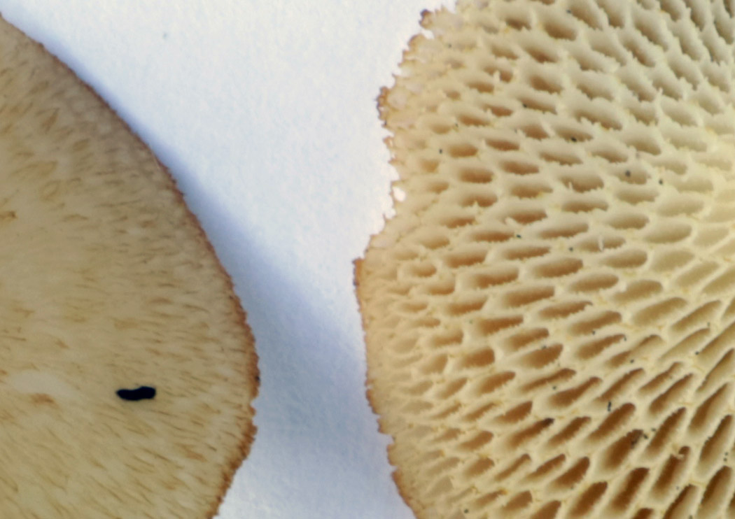 白−淡黄白色 深さ1〜2o 孔口は放射状にのびた楕円形 孔口の大きさ1〜0.5o 柄に垂生