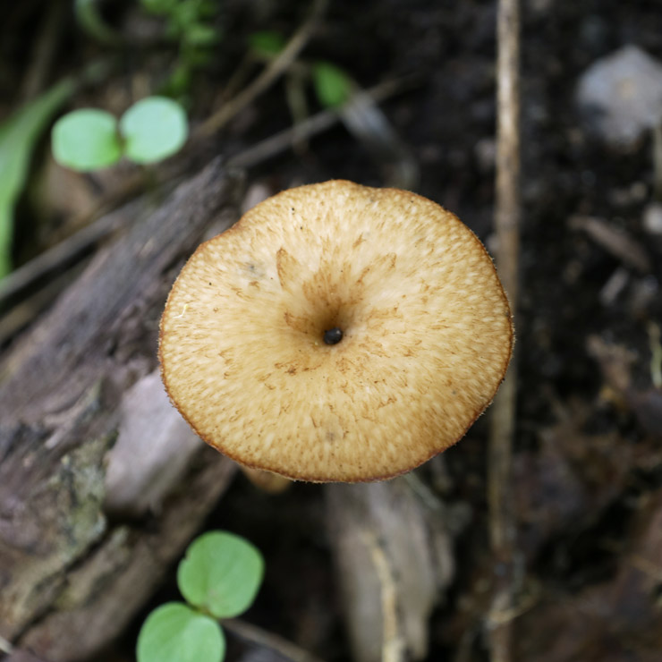 径1.0-5.0cm×1〜3o 円形−丸山形→平 中心へそ状にくぼむ→全体やや浅いろうと形 淡黄色 黄白−淡褐色のささくれ状鱗片あり