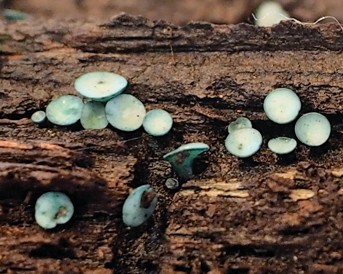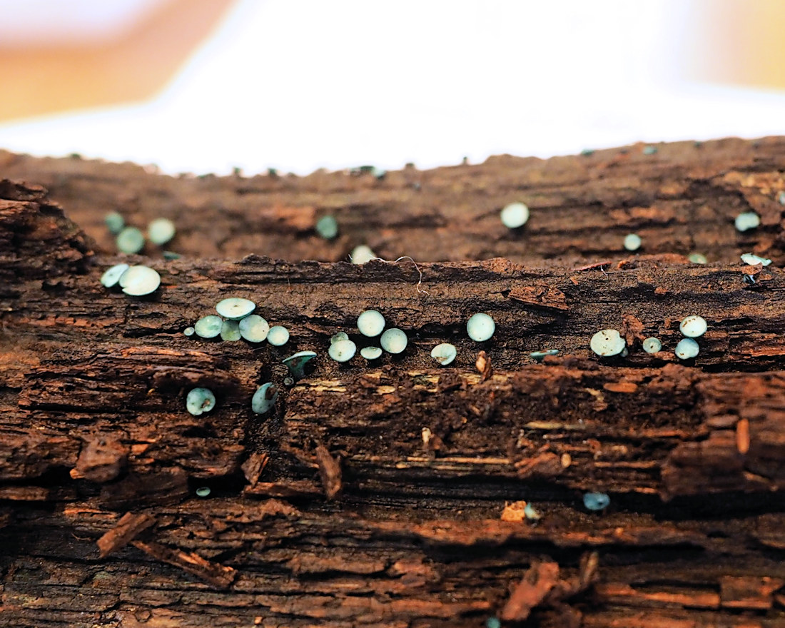 本菌が発生している材は青緑色に染まる。類似種のロクショウグサレキンやロクショウグサレキンモドキは子実層面が青緑色
