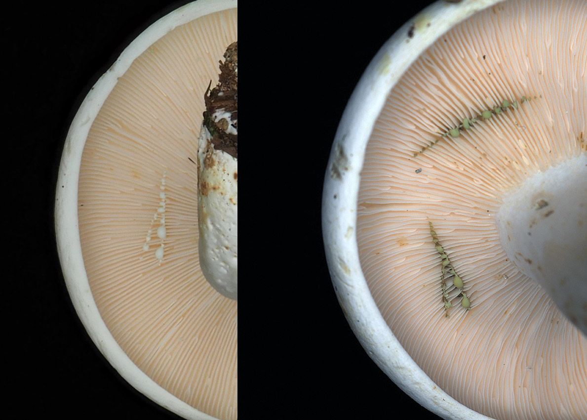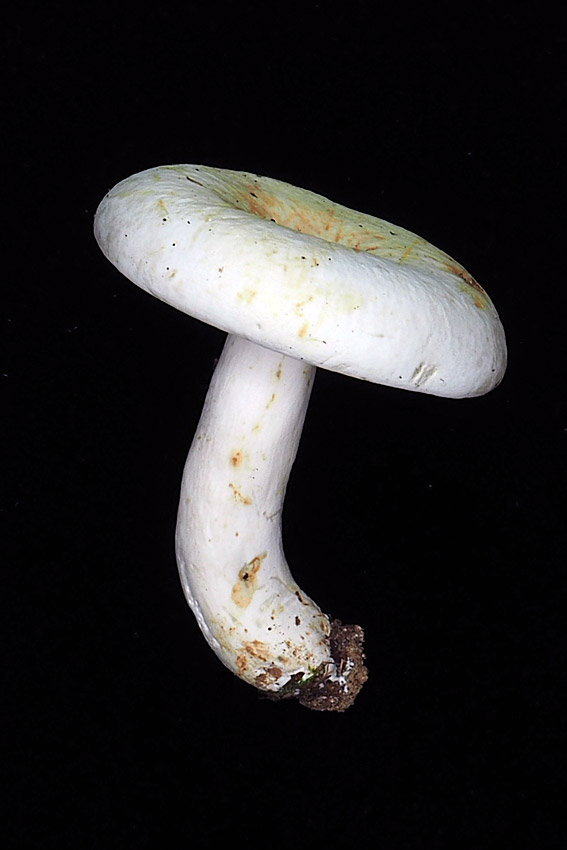 4.5-15.0cm 中央窪む饅頭形→じょうご形 白色−乳白色→淡帯黄色 しばしば汚黄色‐汚黄褐色のしみできる 粘性無し 多少しわがある−ほとんどしわがない