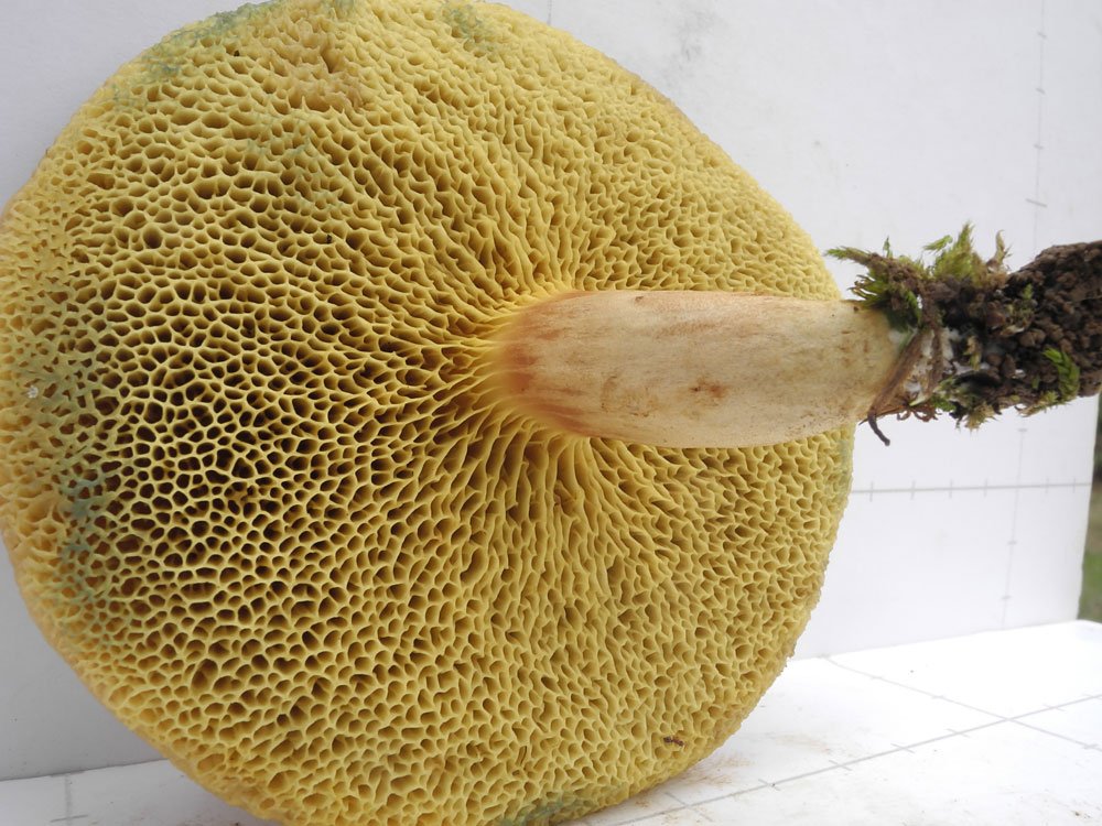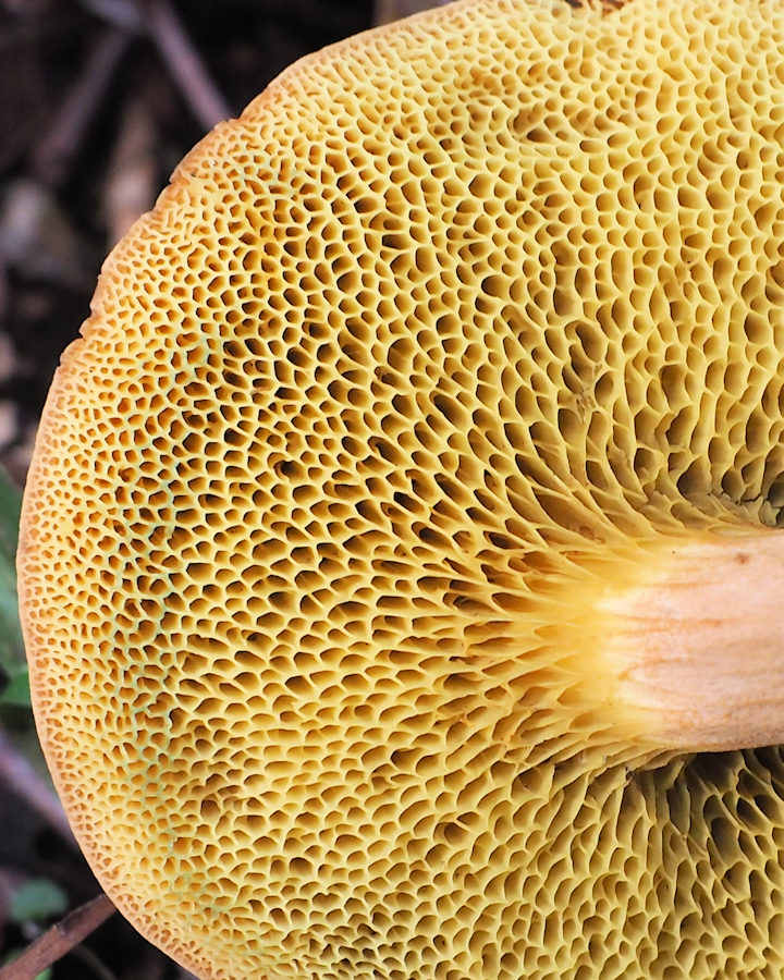 鮮黄色−緑黄色 傷つくとやや青みを帯びる 直生-上生 孔口は大型で多角形