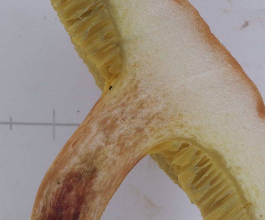 傘部は黄白色−淡黄色 柄部は白色-淡褐色 切断すると変色しないか僅かに青変する 表皮下は表面色帯びる