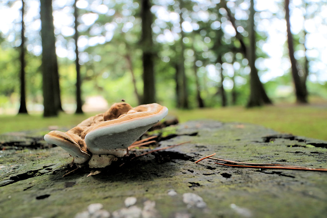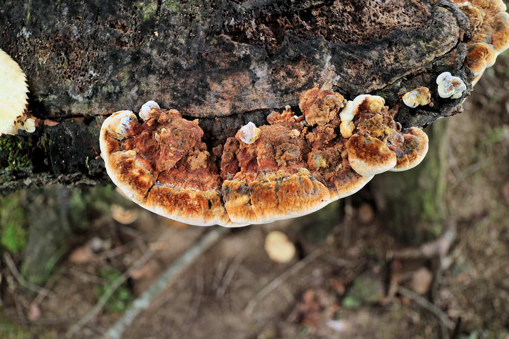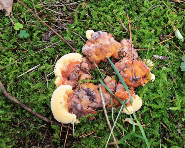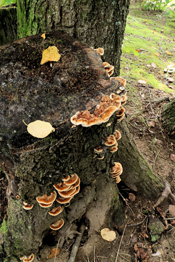 横幅5.0-20.0cm厚さ0.5-1.5cm 半円形−扁平 乾けば下方に湾曲 表面に薄い殻皮こうむる 卵黄色→黄褐色→黄褐色→栗褐色-黒褐色 無毛 不鮮明な環紋と環溝表す