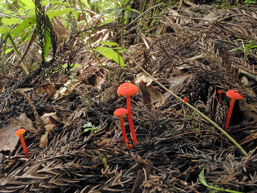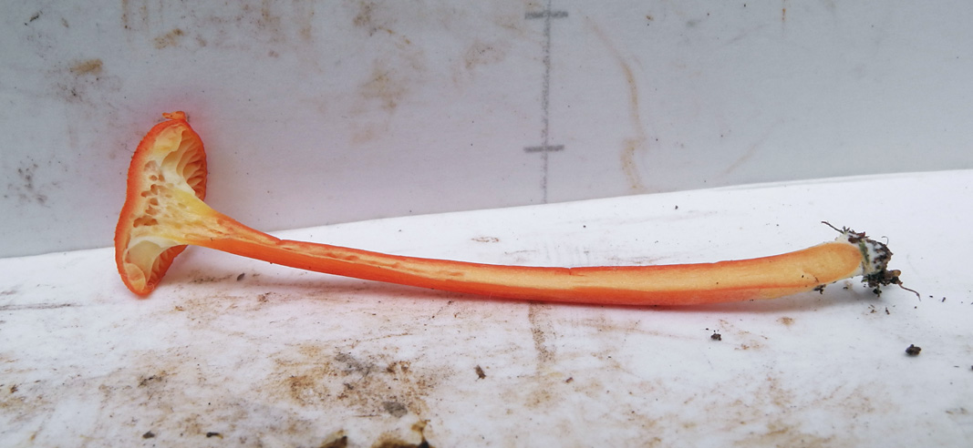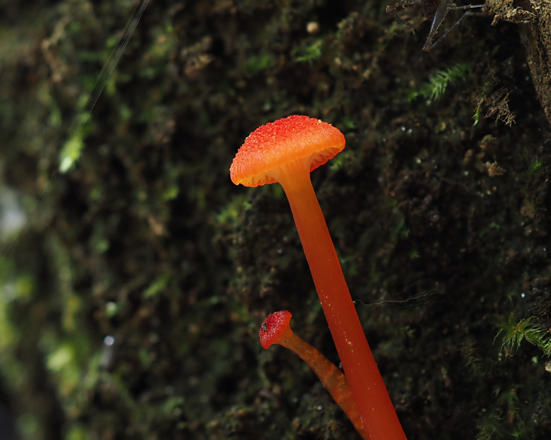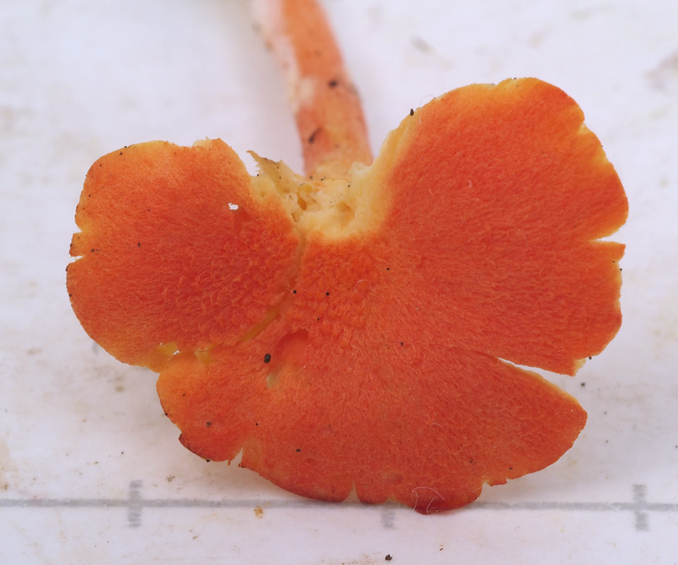 4.0-9.0cmx1.5-4mm 傘と同色−朱赤色 基部帯黄色−黄白色 ほぼ上下同径 中空
