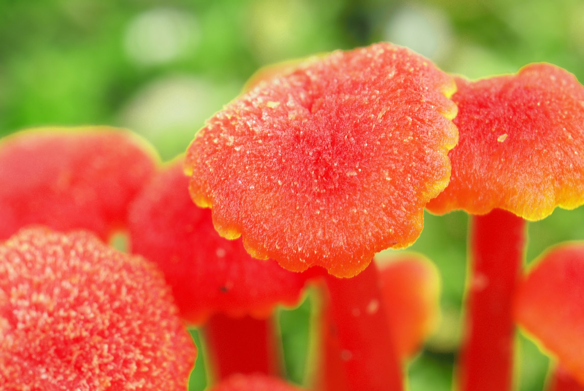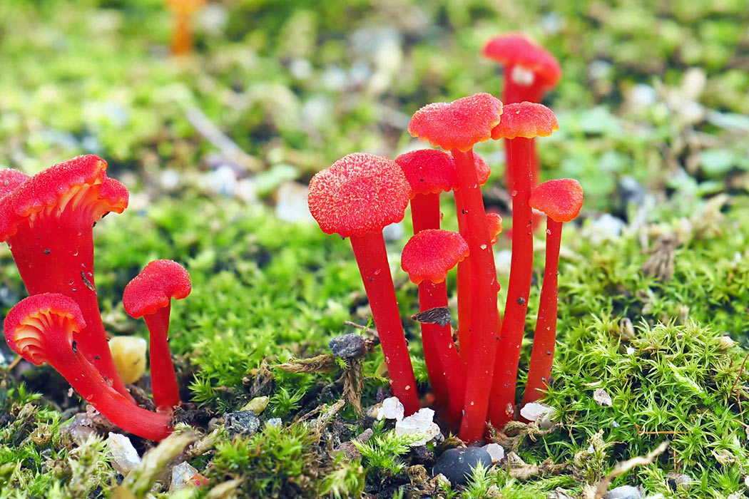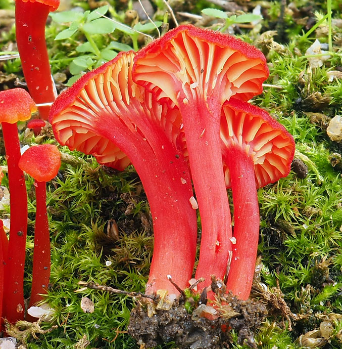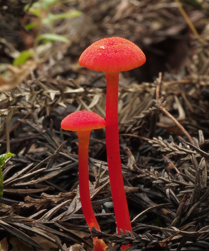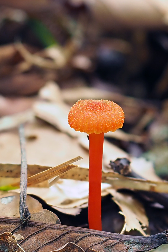 4.0-9.0cmx1.5-4mm 傘と同色−朱赤色 基部帯黄色−黄白色 ほぼ上下同径 中空