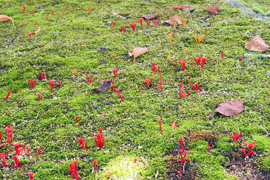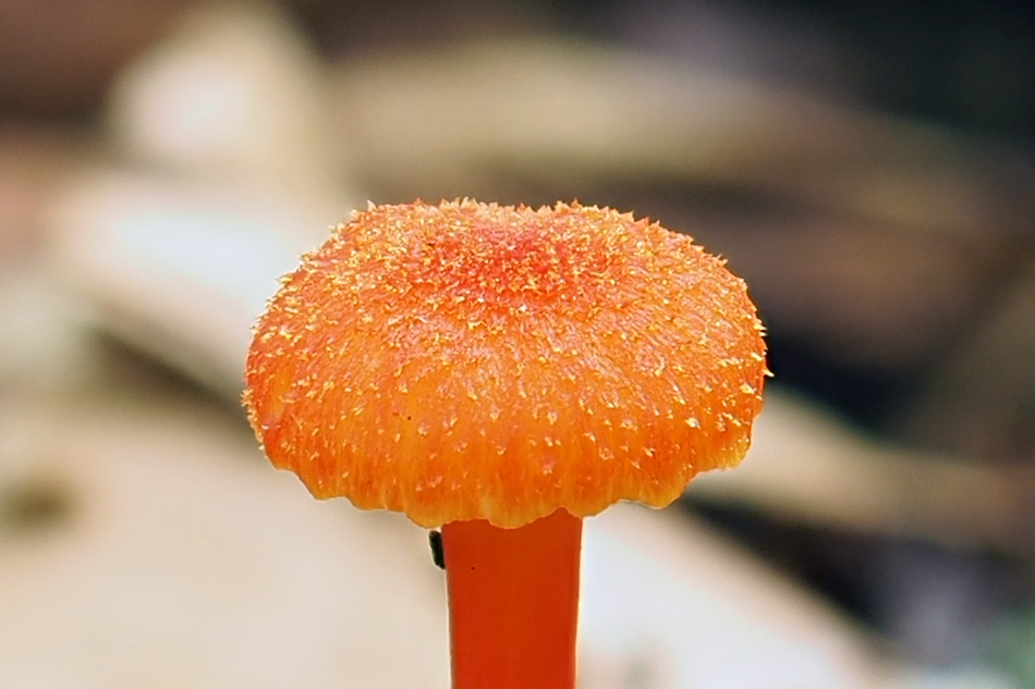 1.0-3.5p 半球形→平たい饅頭形→平ら→浅皿状 ときに中央くぼむ 縁部永く内巻き 朱赤色 粘性無し 細鱗片に覆われる 鱗片は黒みを帯びない−黒変することはない