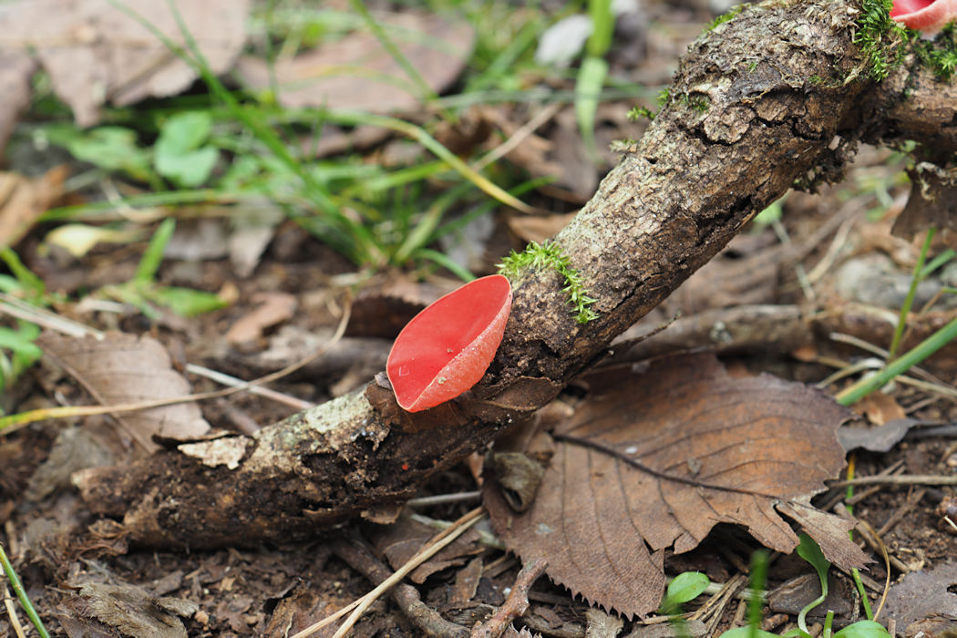 夏〜秋に雑木林内の腐朽材や落枝上に発生する