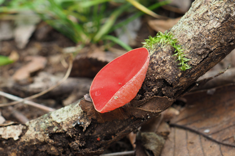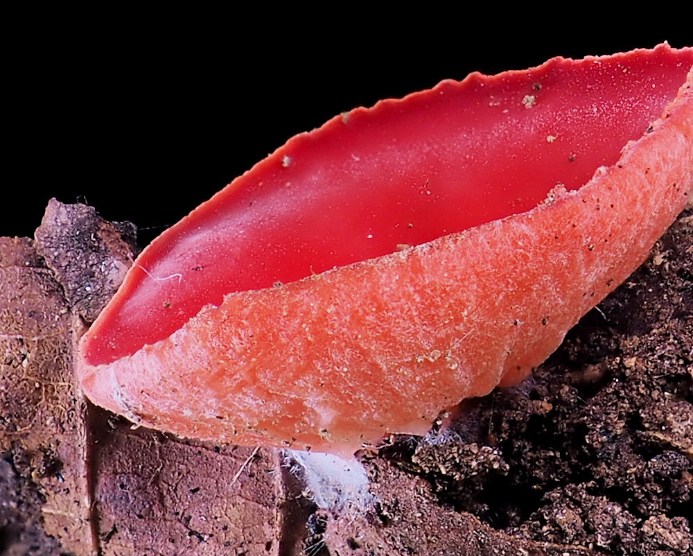 径3.0p-6.0p やや浅い椀形-椀形-皿状 子実層面は鮮紅色−鮮紅色 ほぼ平滑 椀の外側白色綿毛生じ白っぽく見える