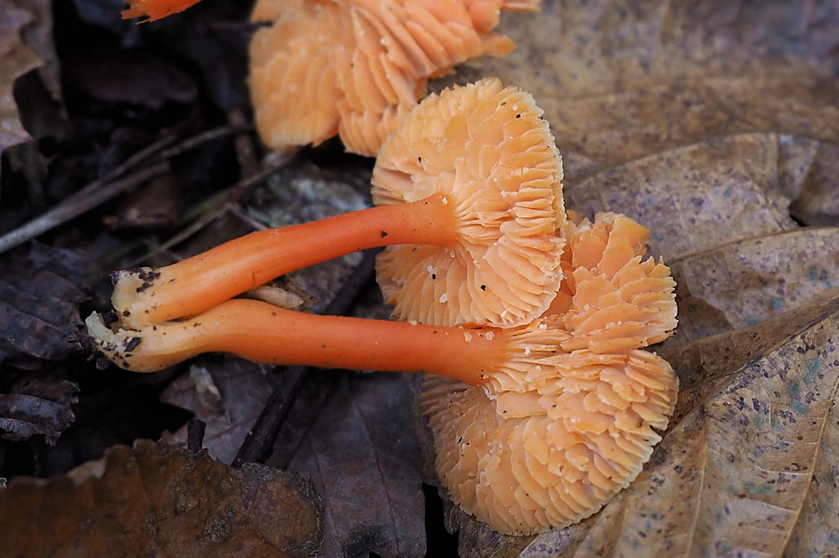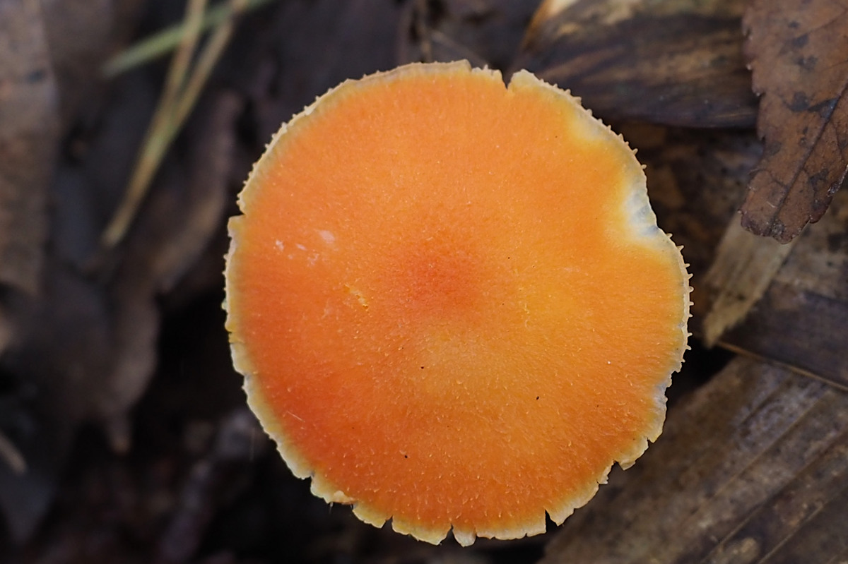 橙黄色 傘肉に近い部分は赤色帯びる 縁部淡い 直生-上生−しばしば垂生上になることあり やや疎