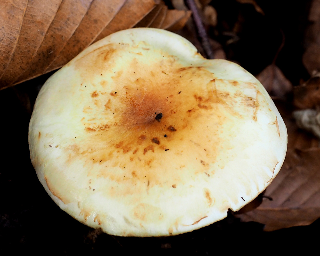 5.0-8.0cm前後 中高のまんじゅう形→やや中高の平たい丸山形 強粘性 中央は黄色 周辺に向かい淡色 中央に茶褐色細鱗を密に圧着 周辺は黄白色−淡黄褐色の綿毛状鱗片散布 縁に類白色の内皮膜の名残り付着→消失