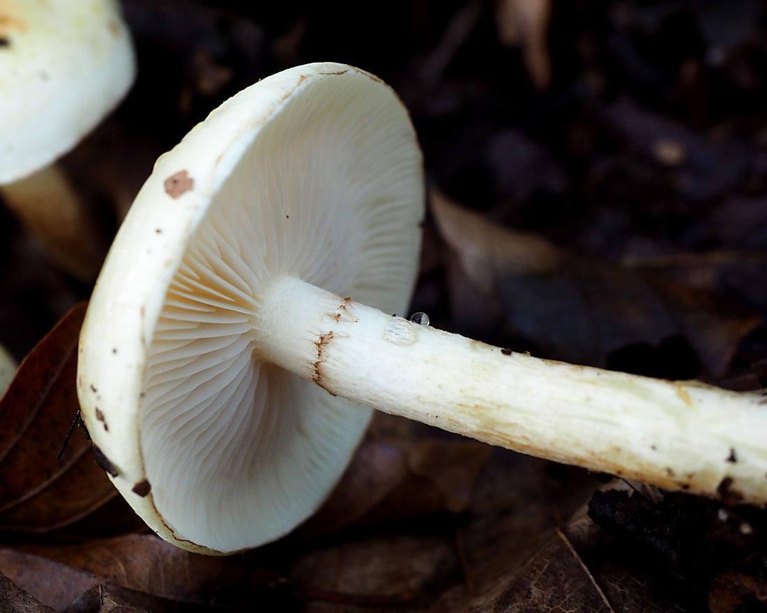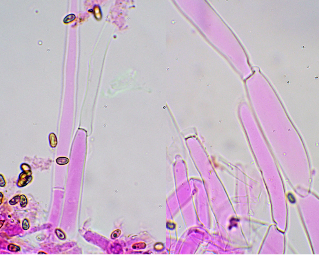 7.0cm前後×10mm前後 上部は淡黄白色 下部は帯褐色 繊維状ーささくれ状 基部で多少膨らむ やや中空 淡黄白色綿毛状膜質の薄いつばあり→消失