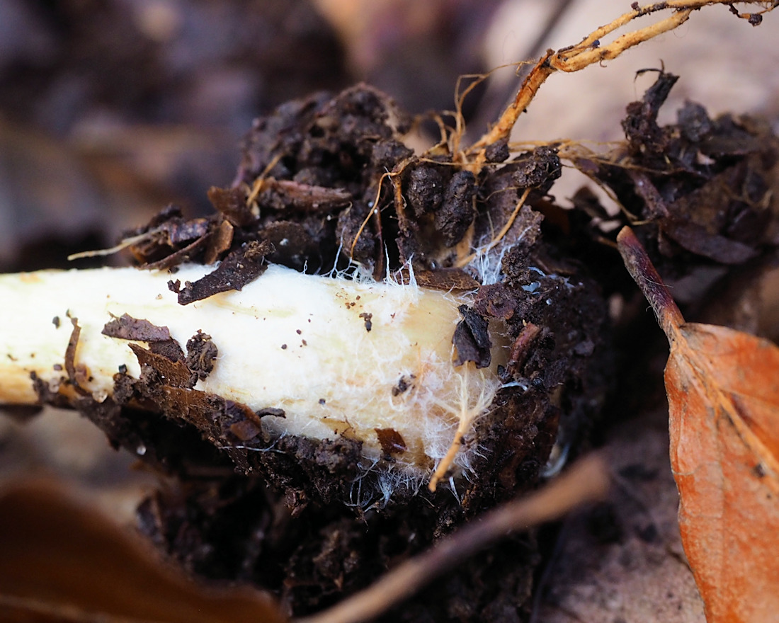 晩秋にブナなどの広葉樹の半ば土に埋まった腐朽材上−周辺に発生する