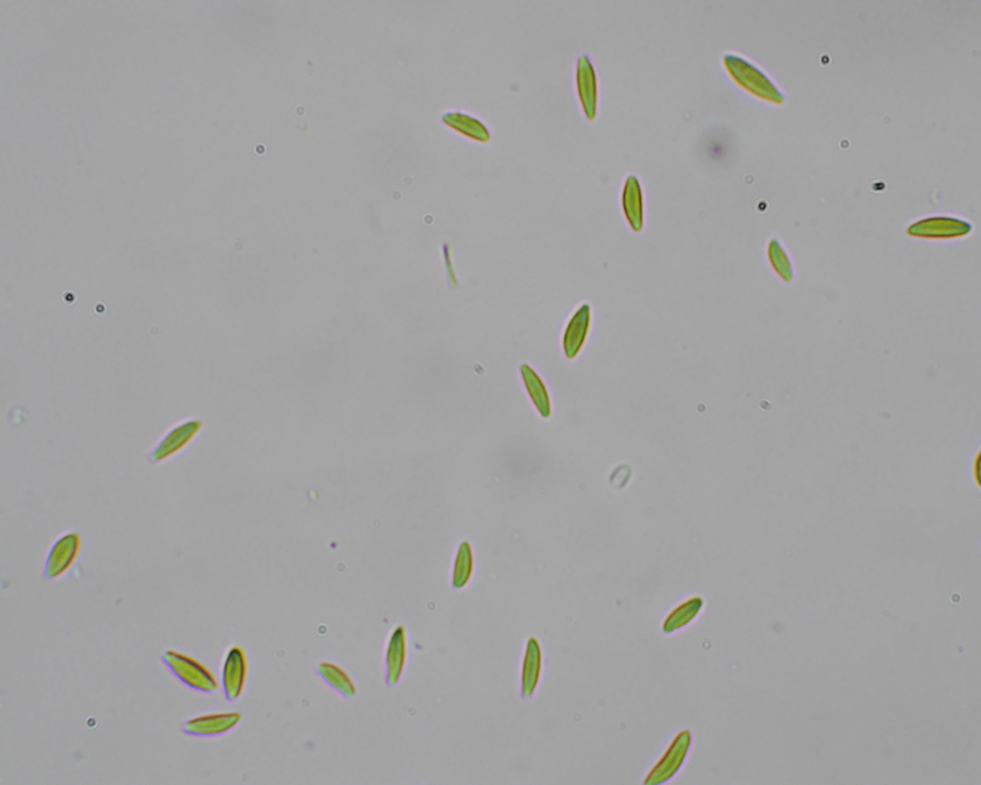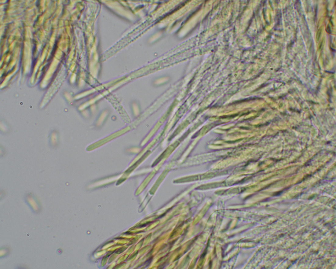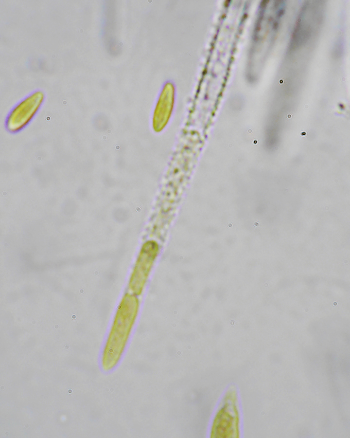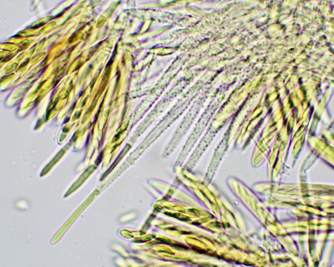 子嚢はこん棒形 基部はかぎ形構造 先端はやや円錐状 サイズは48-63μm×5.4-6.3μm8個の胞子を1列−ときに部分的に2個 頂孔はメルツァー液で青変する 子嚢胞子は両端のとがった紡錘形でやや左右非対称 無色 平滑 サイズ8.0-11..3μm×2.1-3.4μm 顕著な内容物は認めにくい