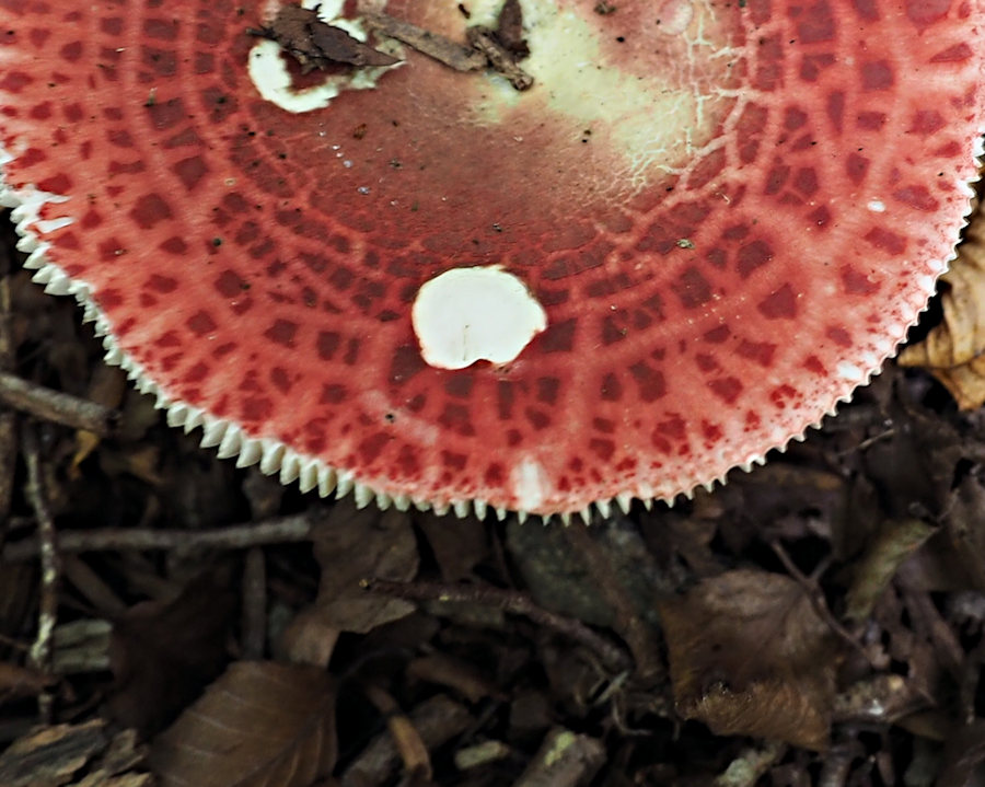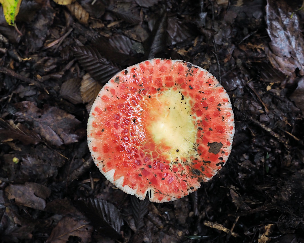 図鑑には傘中央部は「通常暗緑色−緑色を呈す」と記述されているが、傘色はほとんどが赤色系でわずかに緑色を帯びる程度の子実体も確認している。