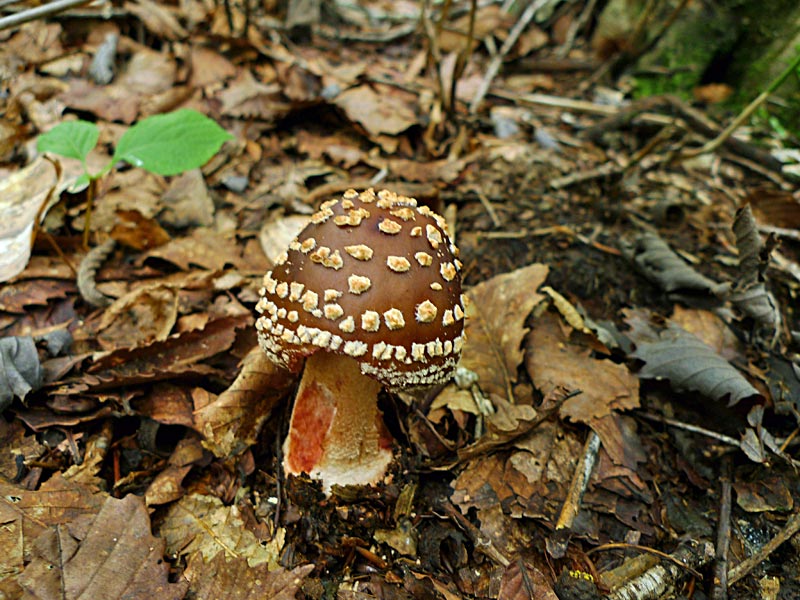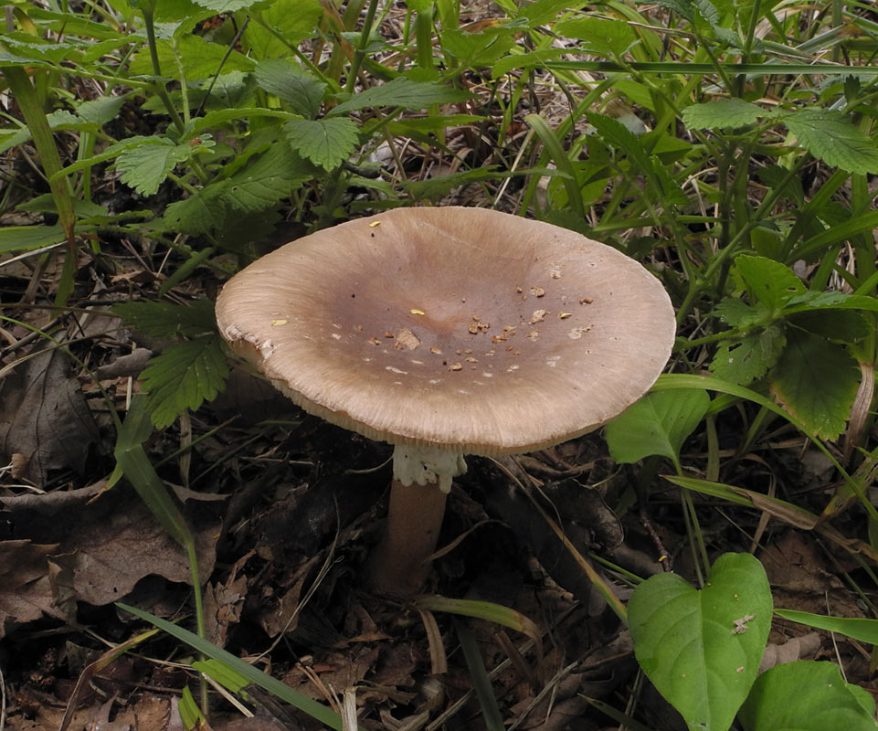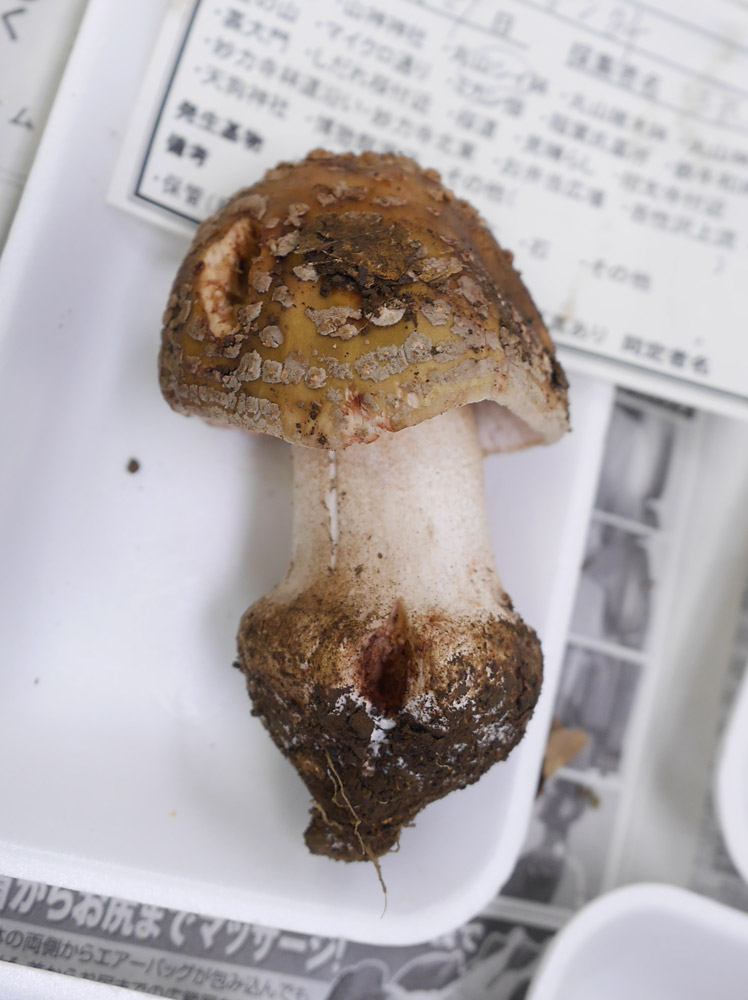 4.0−12.0cm 半球形→饅頭形→扁平→浅皿状 表面湿時粘性あり 帯赤黄土褐色−帯赤褐色−暗赤褐色→周辺淡い 灰白色−帯褐色の粉質いぼ付着 縁部内被膜破片垂下