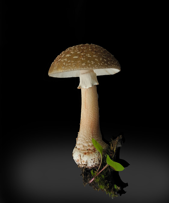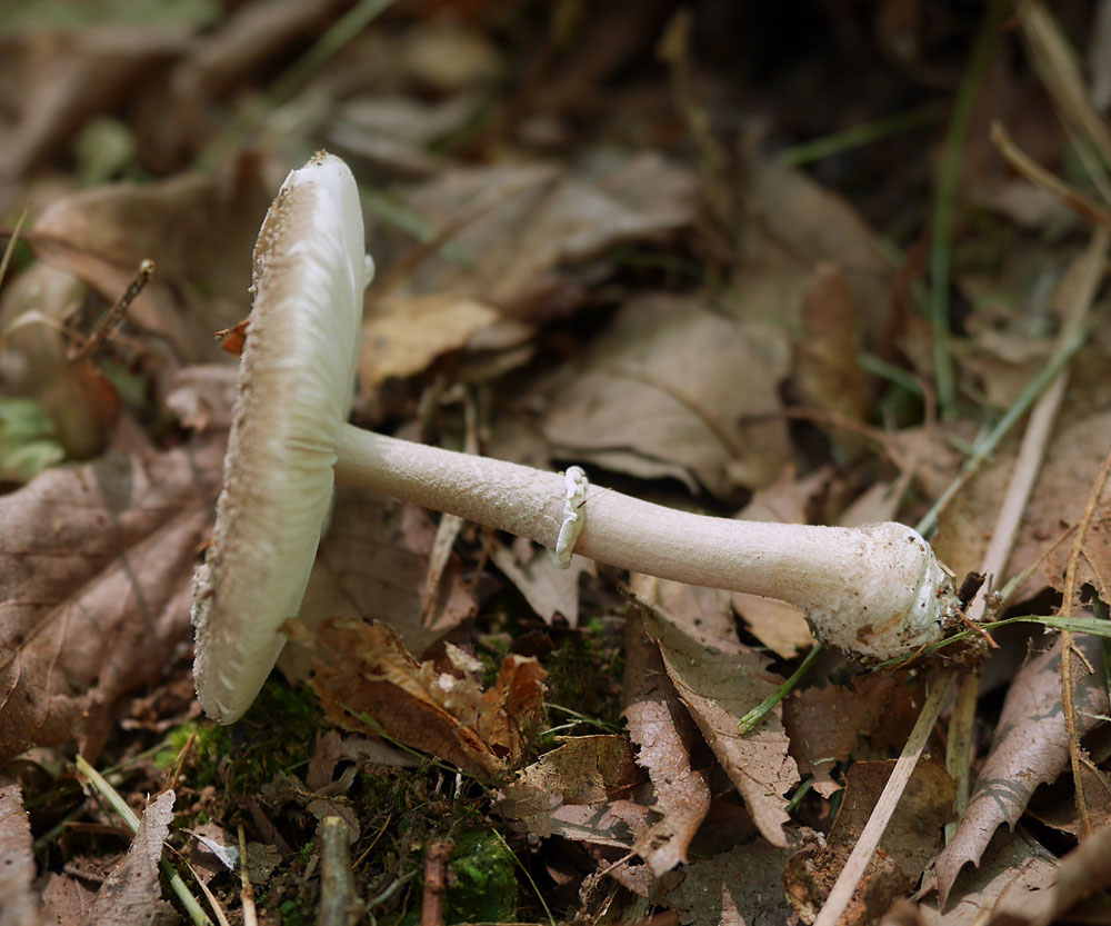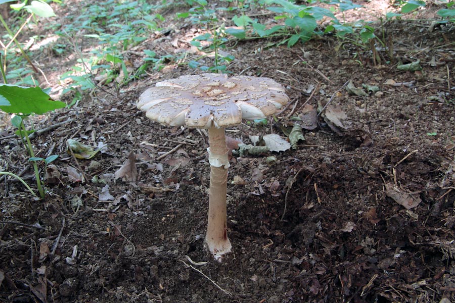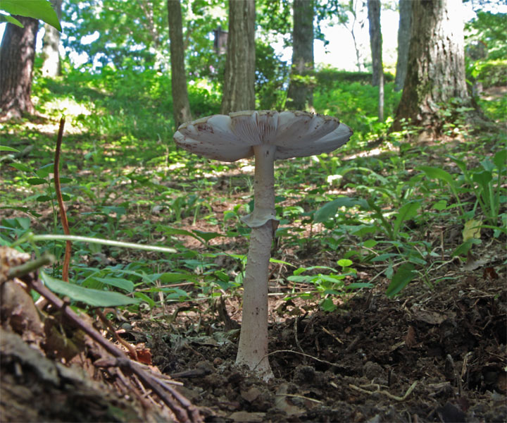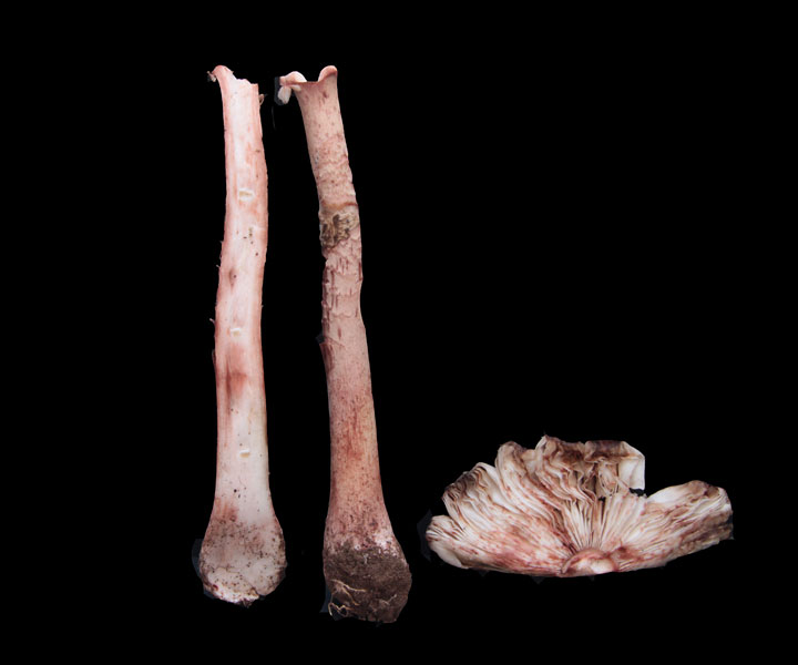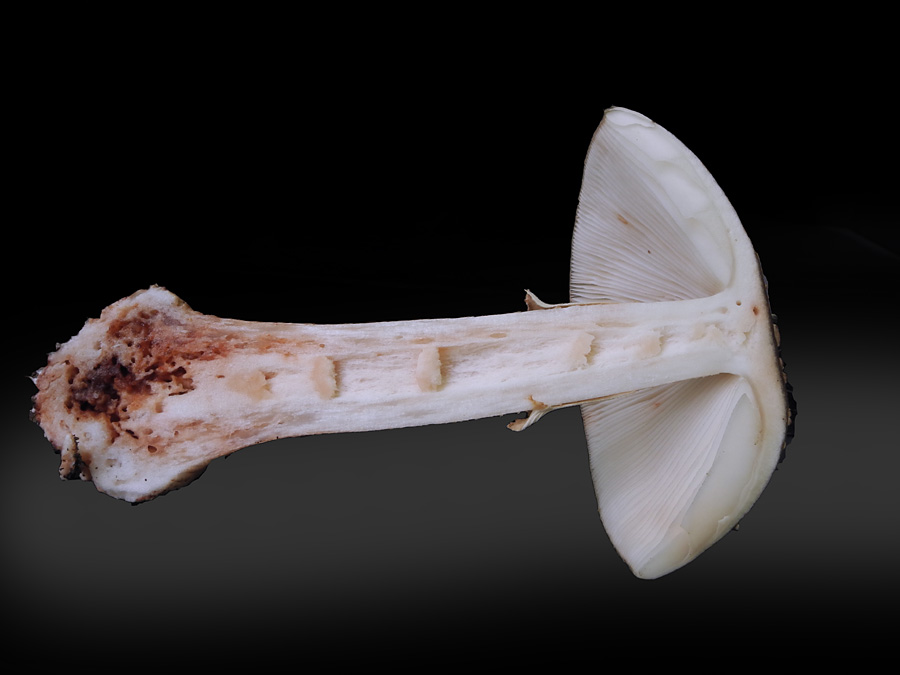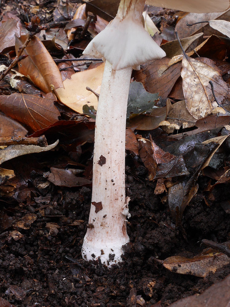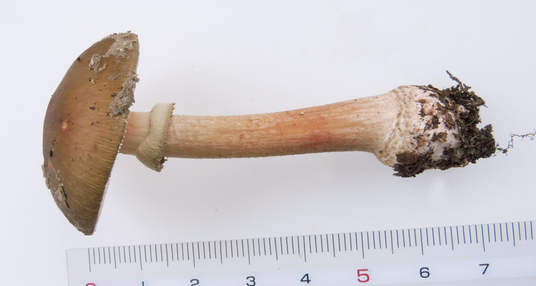 8.0-24.0cm×6-25mm 淡赤褐色 下方ほど濃色 逆こん棒形 基部は球根状に肥大し、粉粒状つぼ破片が多少輪状に付着 上部に類白色膜質つば垂下 中空