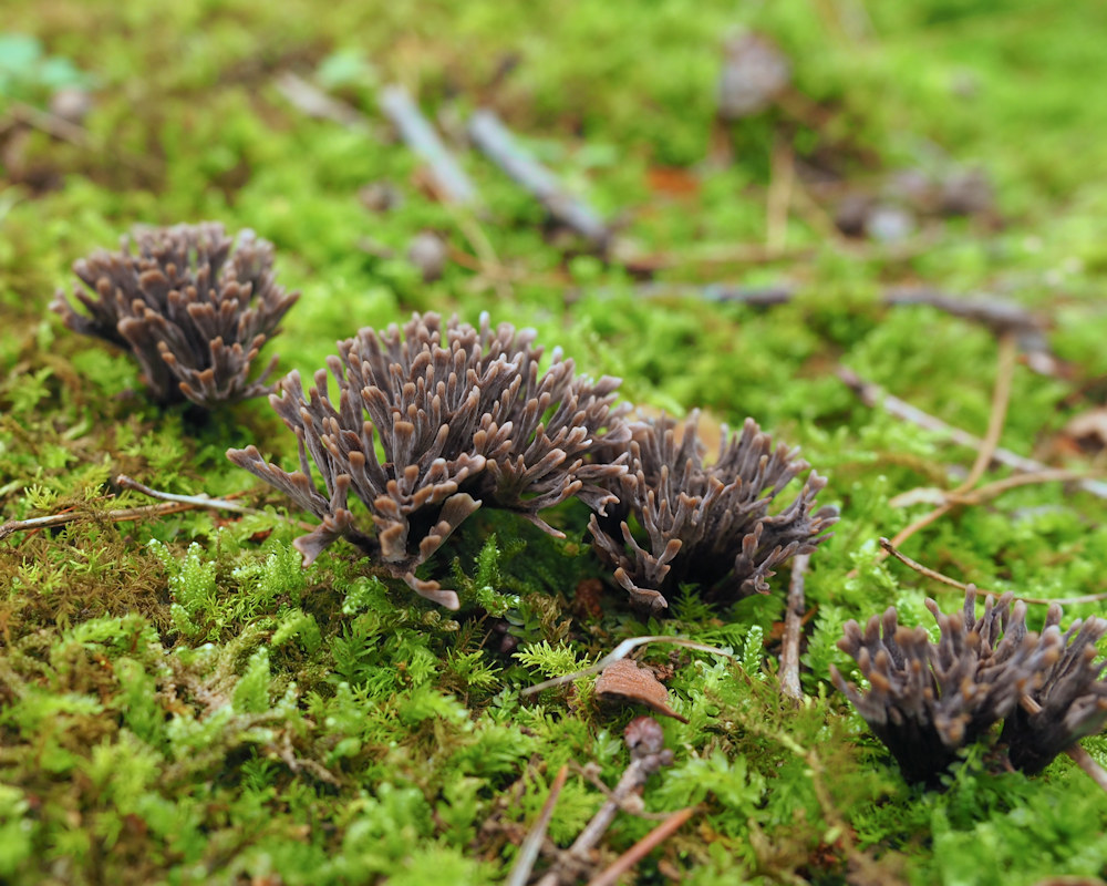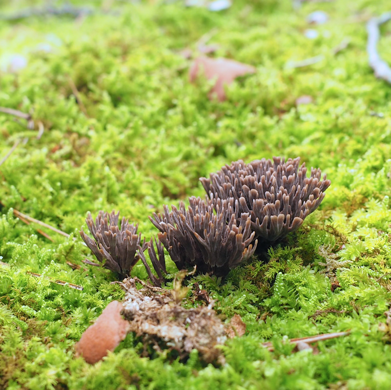 高さ3.0-8.0cm ホウキタケ形 暗灰色−帯紫暗褐色 分岐が少なく上端は鈍頭でとさか状にならない